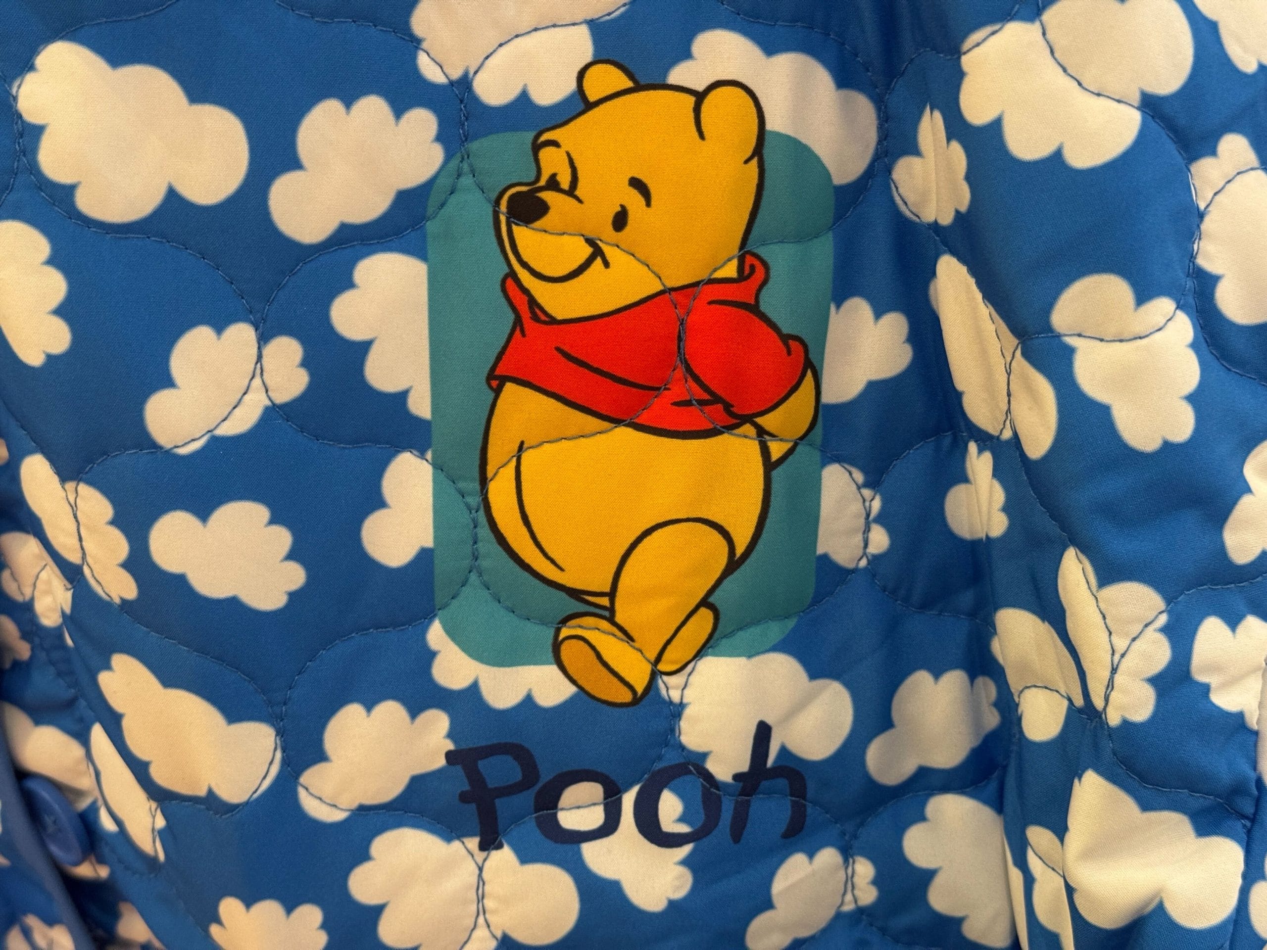 This is a blue jacket with an all-over cloud pattern. It buttons up the front and has two front pockets. Pooh is pictured on the left chest.