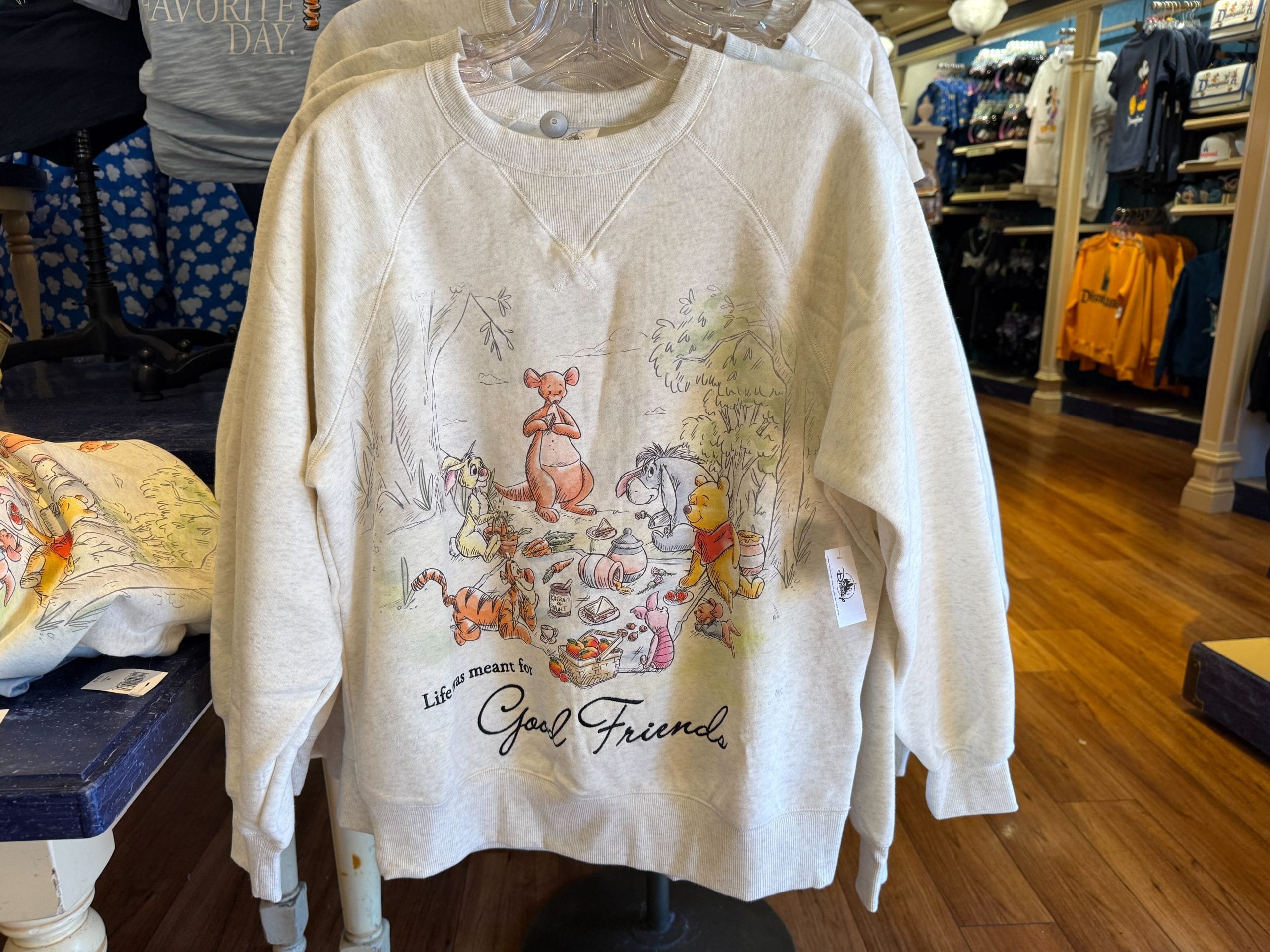“Life is meant for good friends,” reads this sweatshirt. It has artwork of Winnie the Pooh and his pals having a picnic in the Hundred Acre Wood.