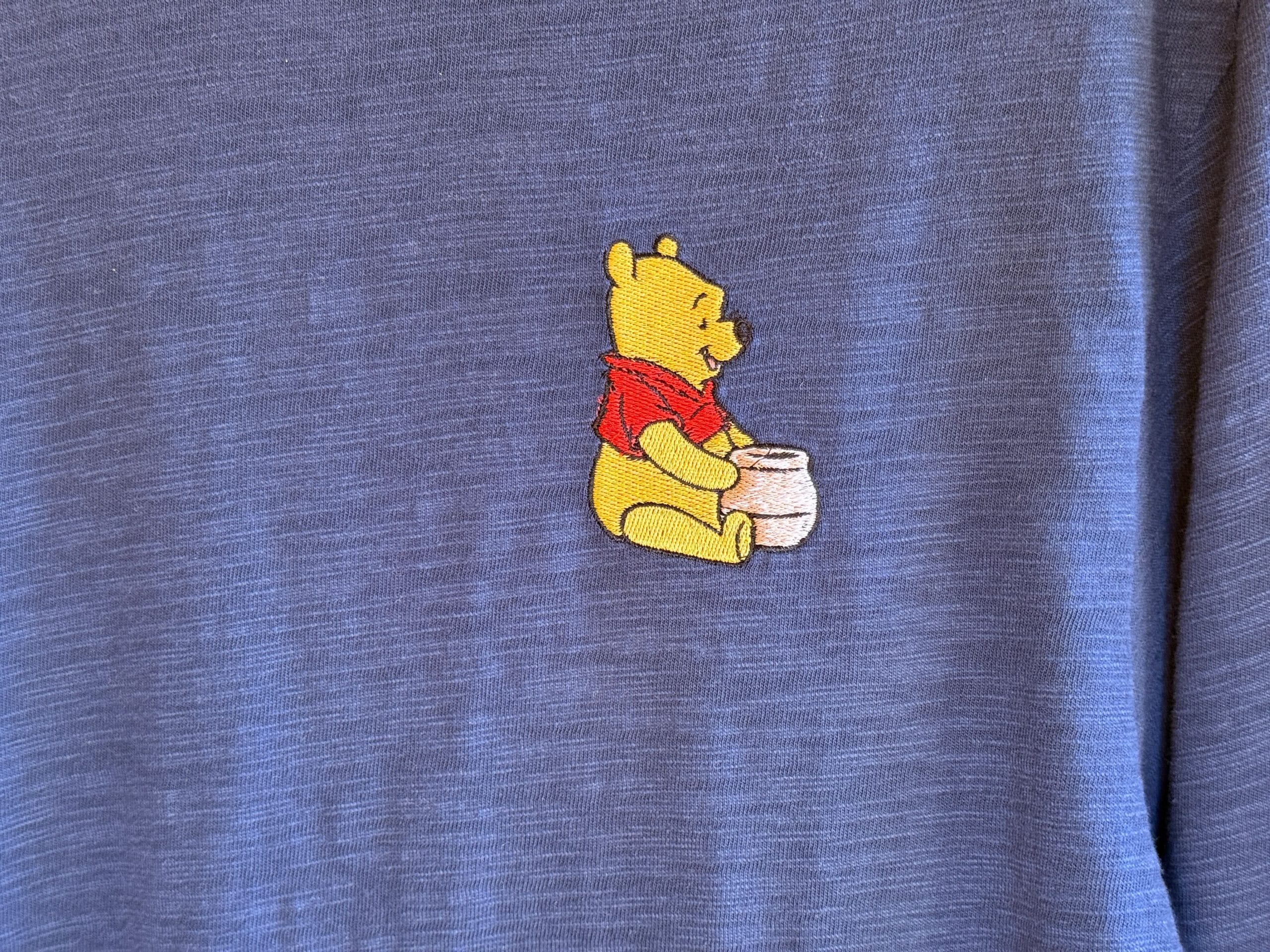 Pooh Bear is embroidered on the left chest of this dark blue shirt.