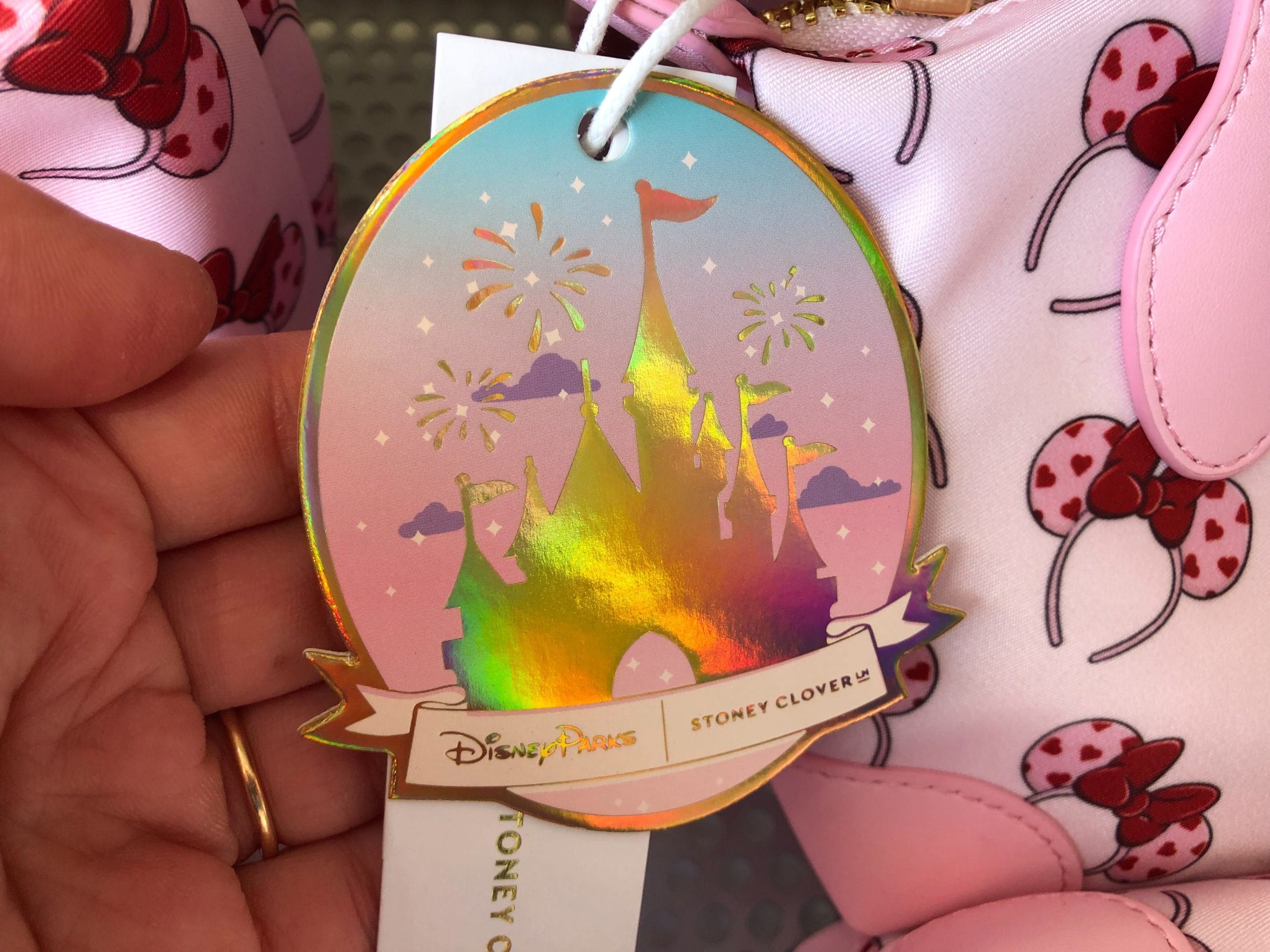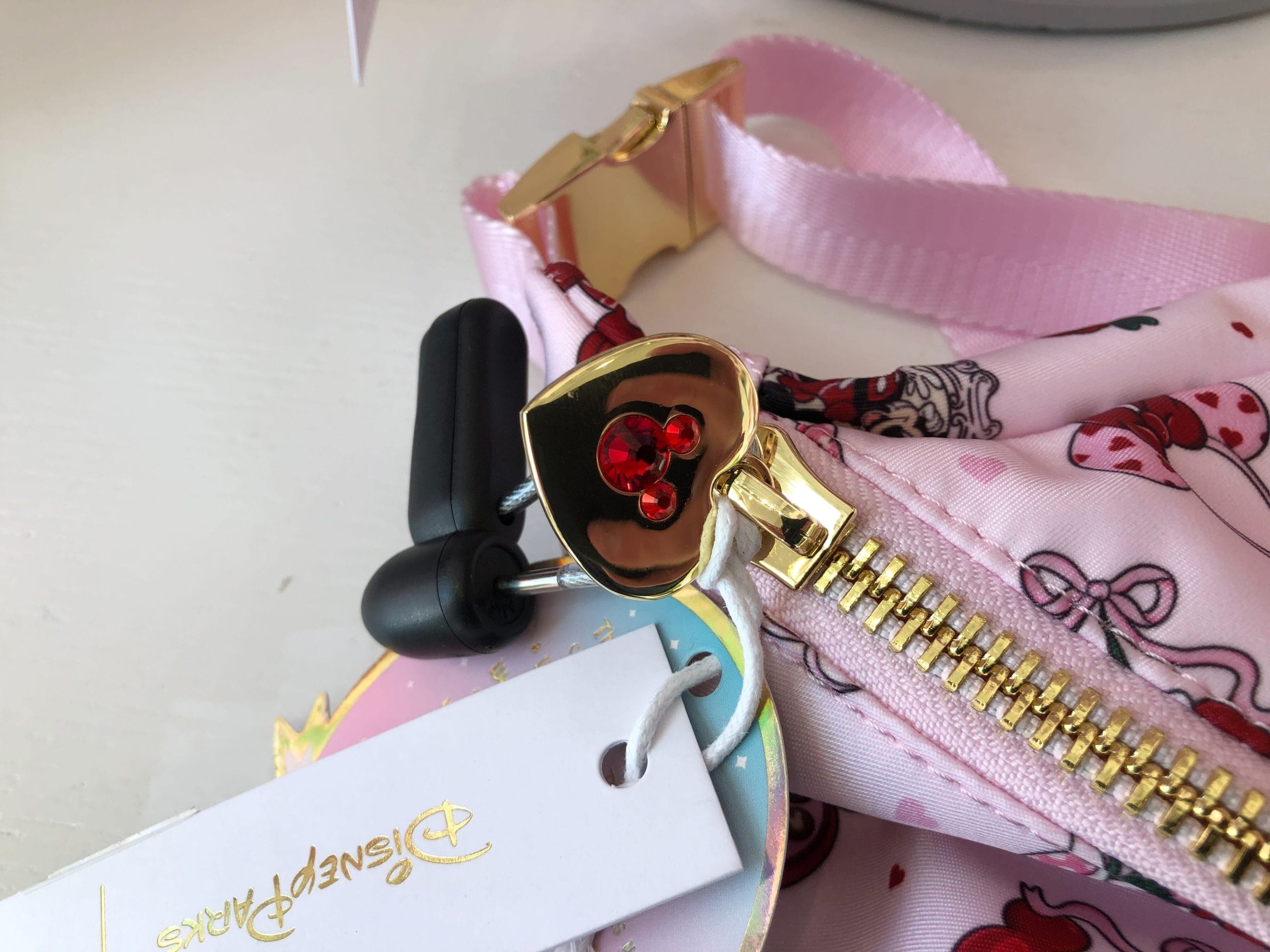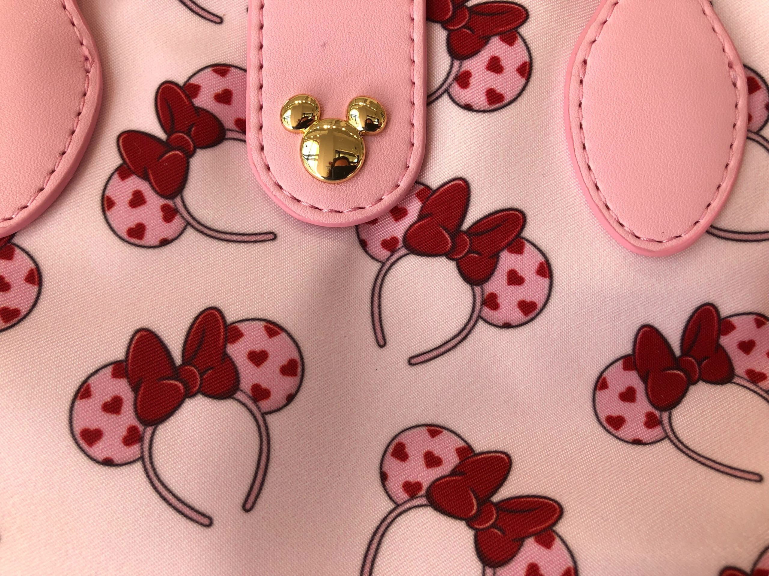 The handbag features a pink pattern of Minnie ear headbands with hearts on them — just like the real-life Valentine’s Day Minnie ear headband. The rest of the detailing on the bag is plain pink.