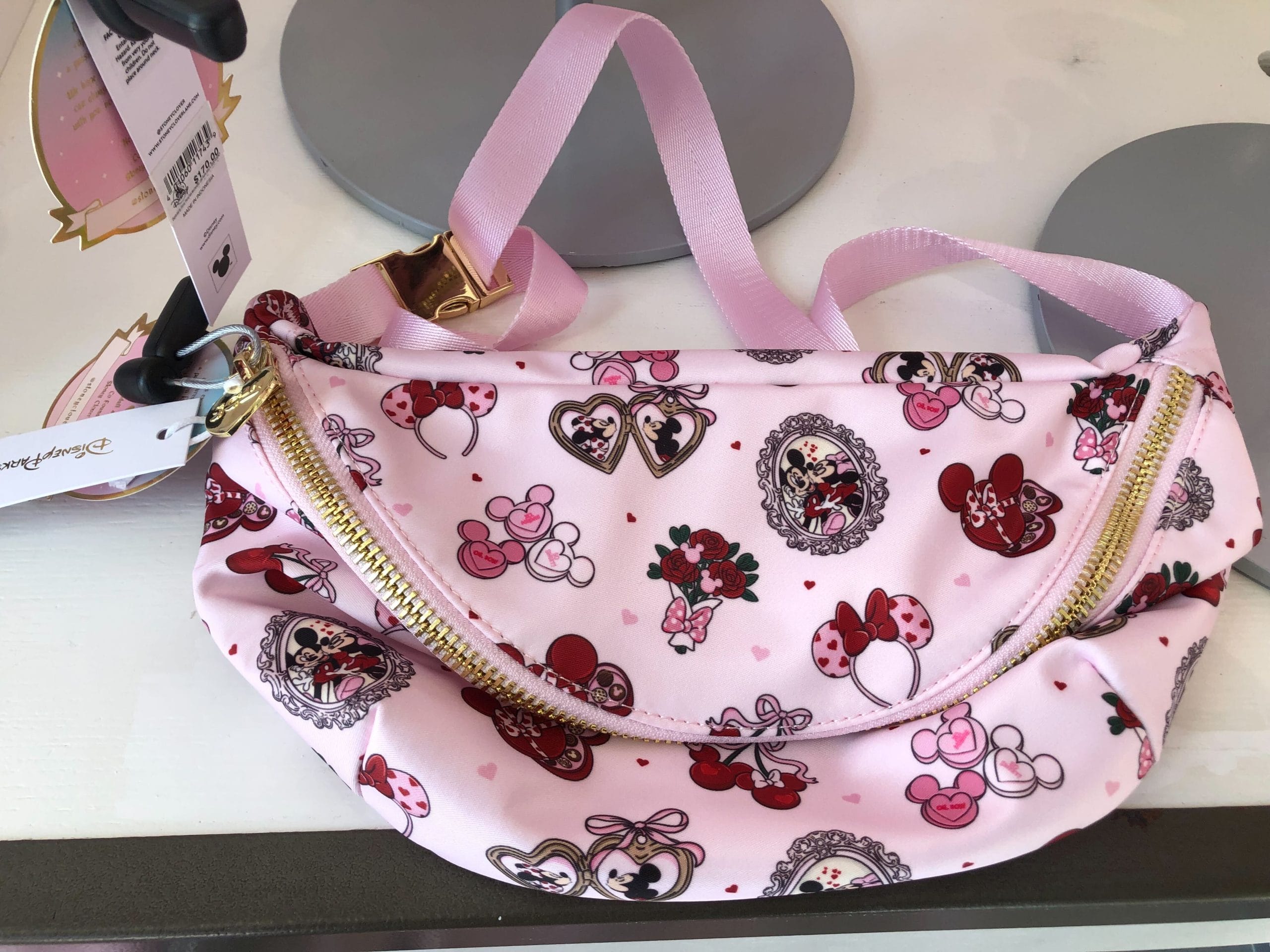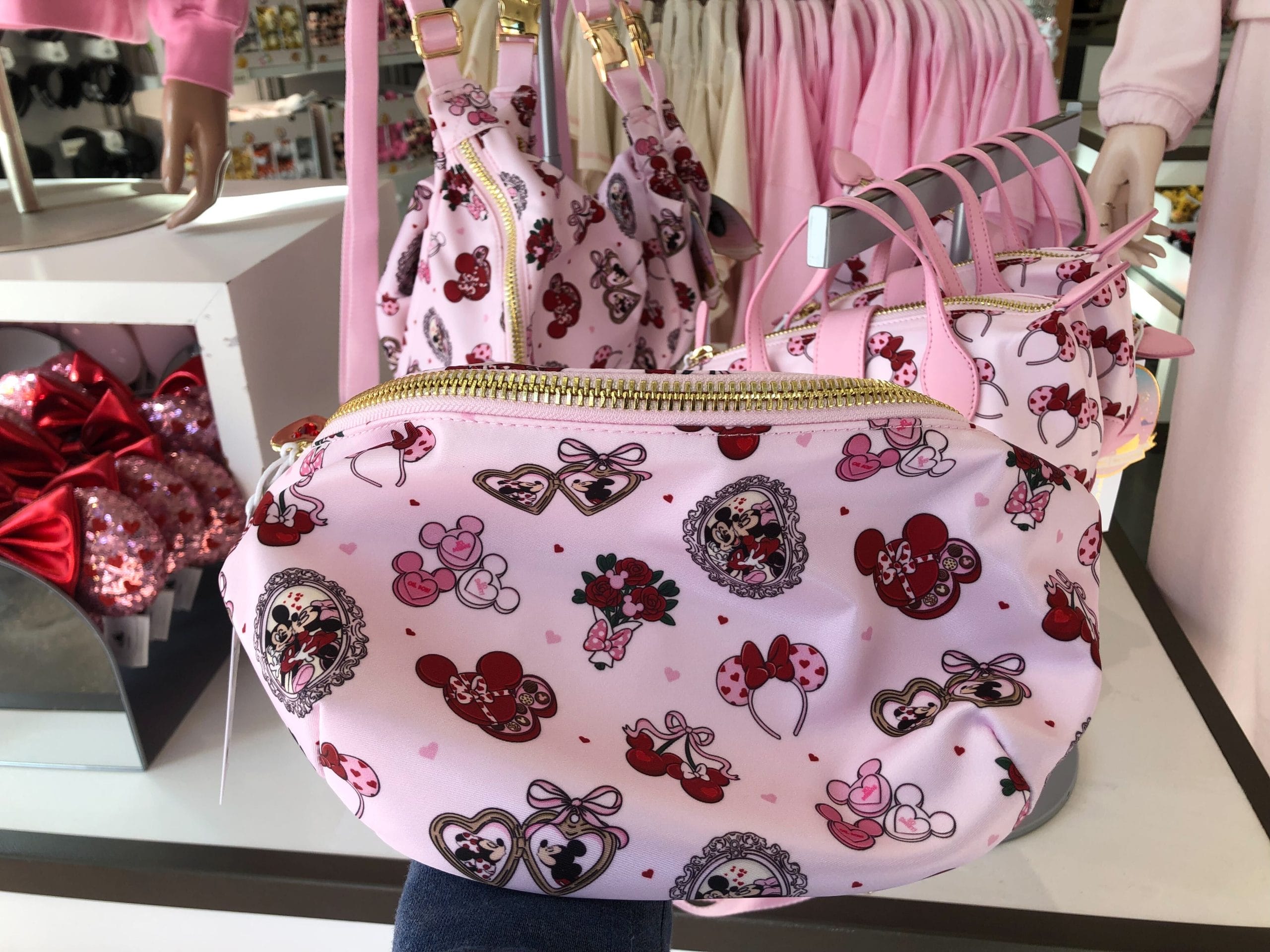 The crossbody bag features a different pattern with a pink background with Minnie ear headbands, alongside several other items reminiscent of Valentine’s Day. These include Mickey and Minnie Mouse kissing each other in a fancy picture frame, a locket, and a flower bouquet with Minnie’s bow tied to it. A box of chocolates, as well as some Mickey emblems with a heart message inside, are also present.