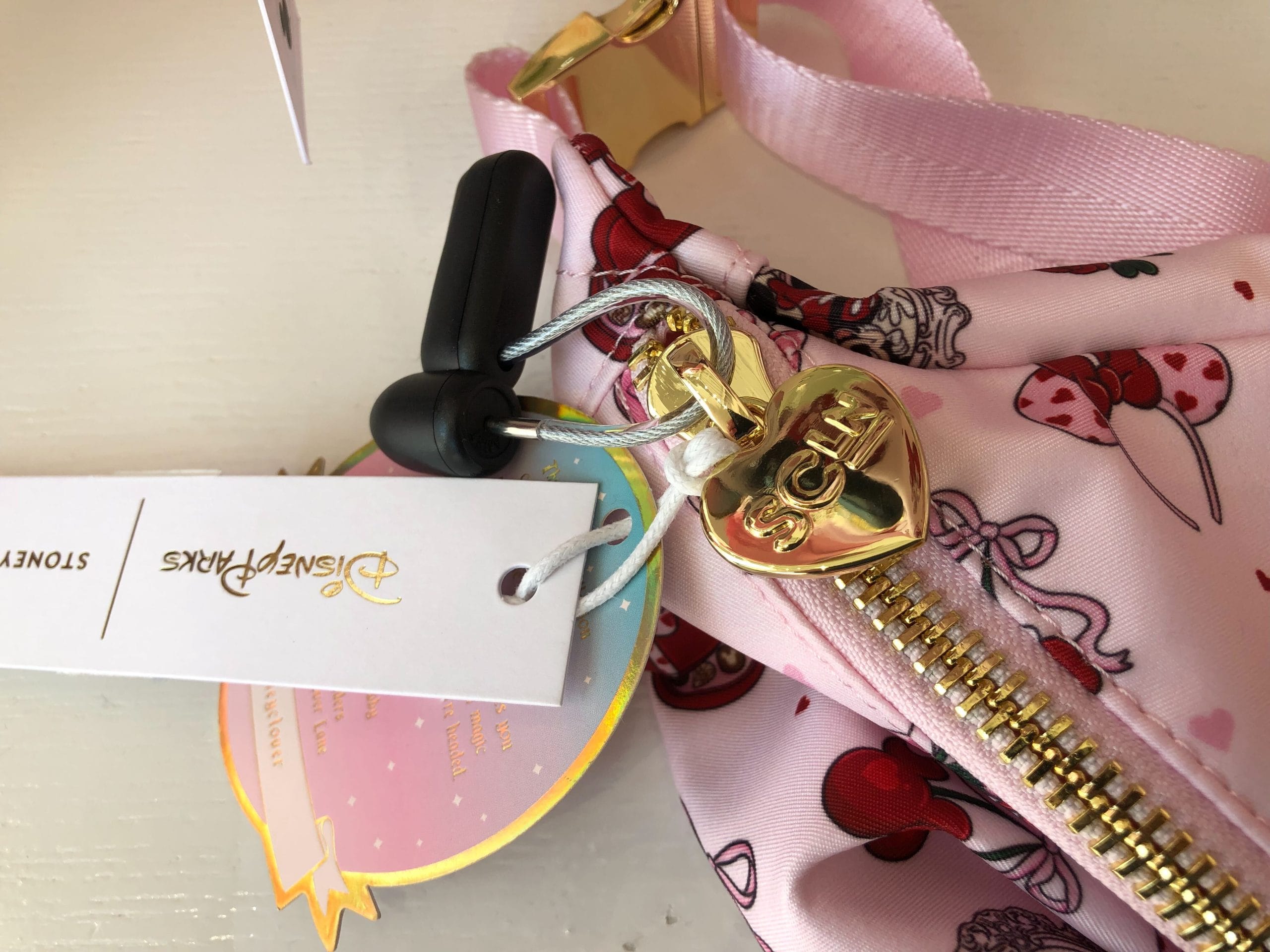 The zipper features a red, crystal Mickey emblem inside a golden heart with the Stoney Clover Lane logo on the other side.