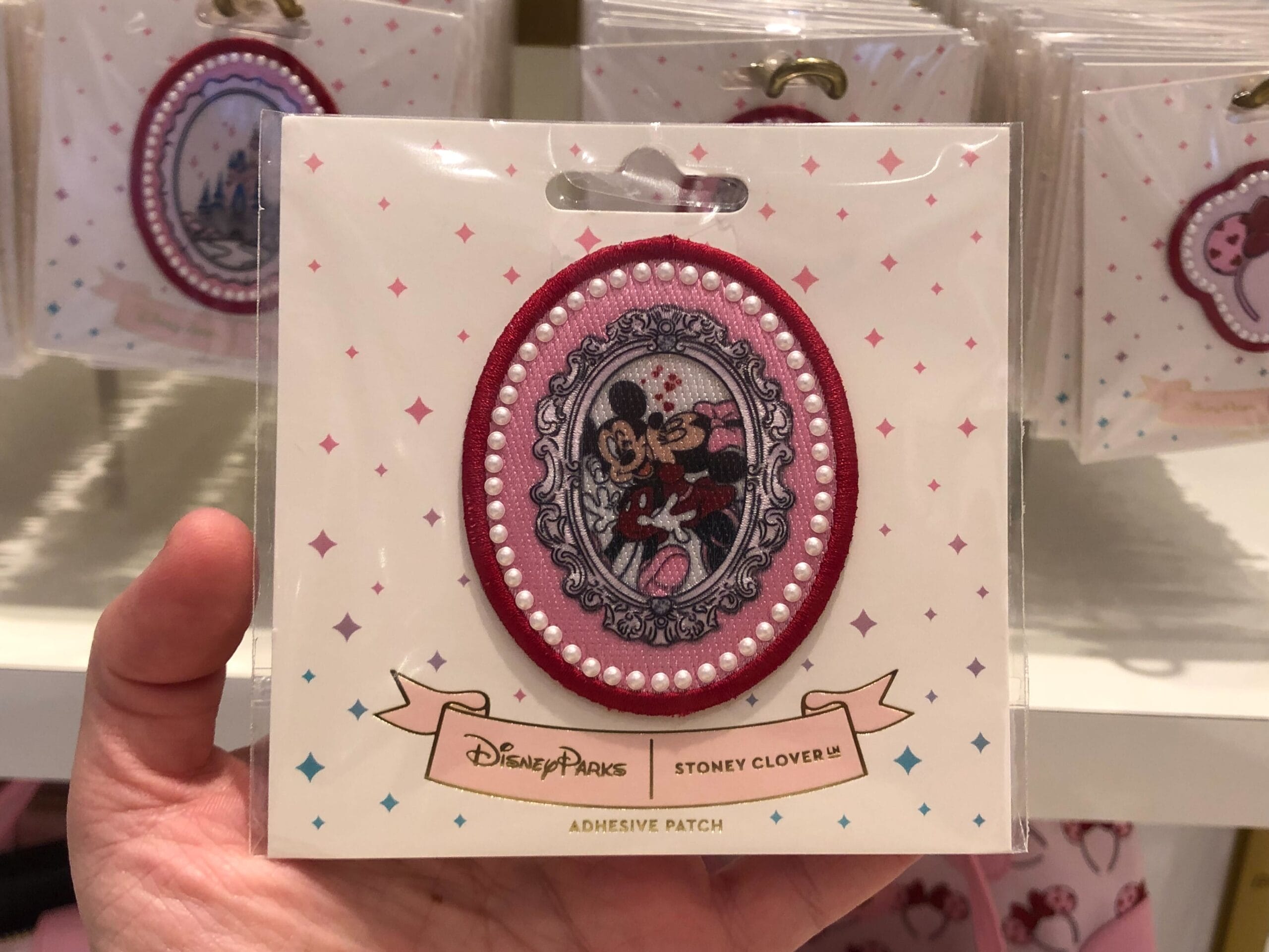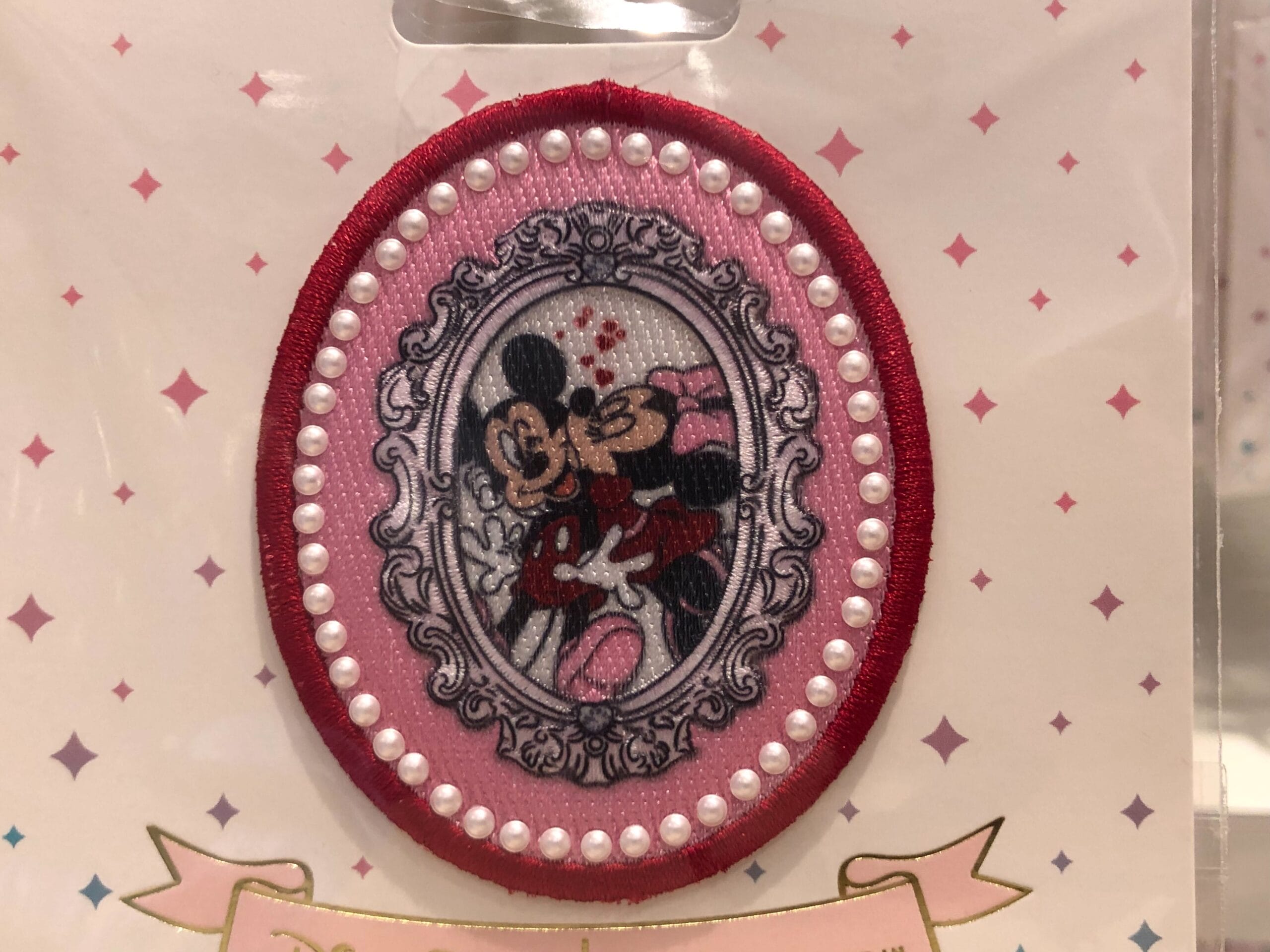 The final patch features Minnie kissing Mickey’s cheek while red hearts appear above their heads. Mickey and Minnie are wearing red shorts and a red dress respectively, and Mickey is wearing pink shoes while Minnie is wearing a pink bow. They are depicted inside of an ornate picture frame.