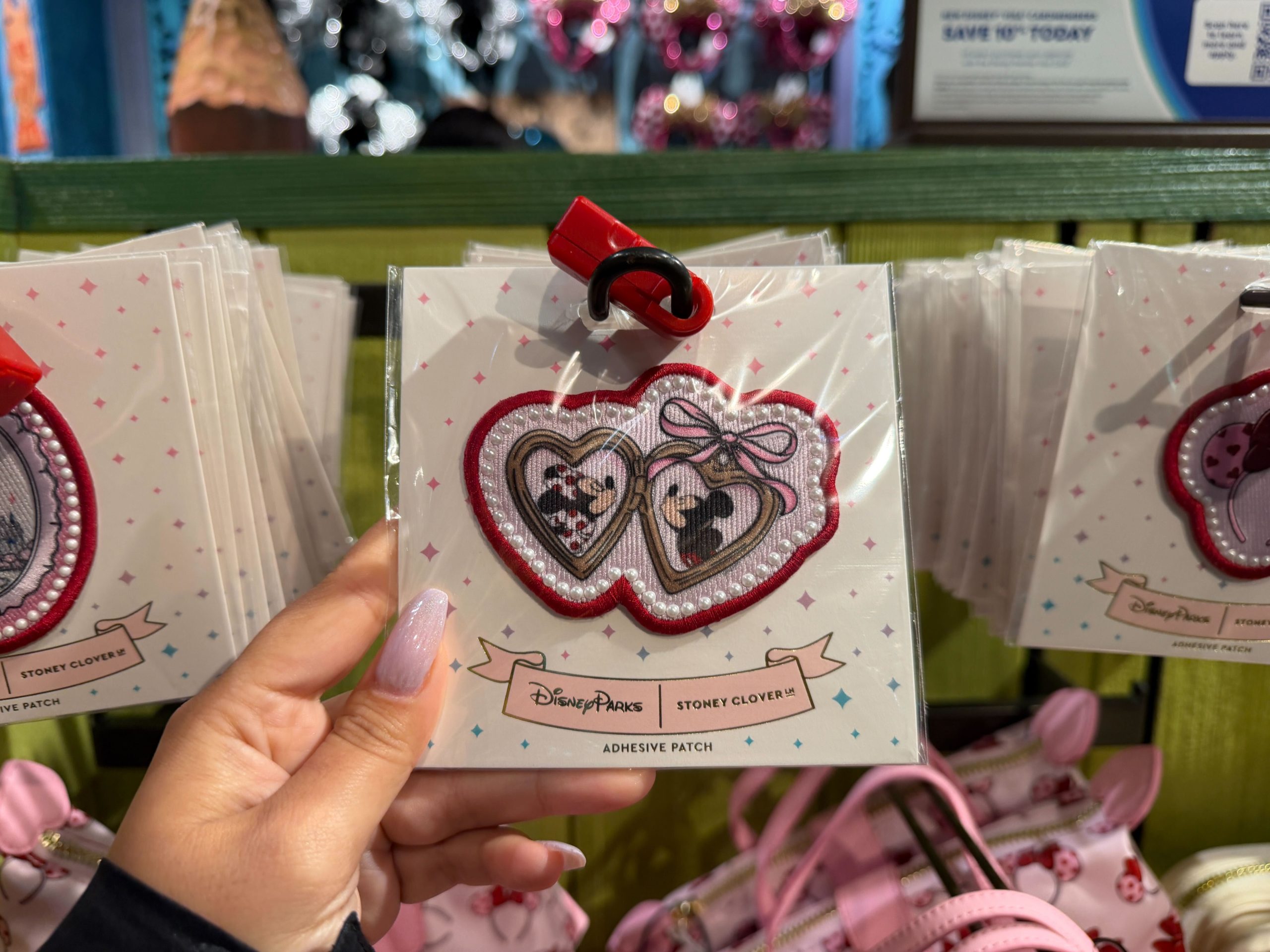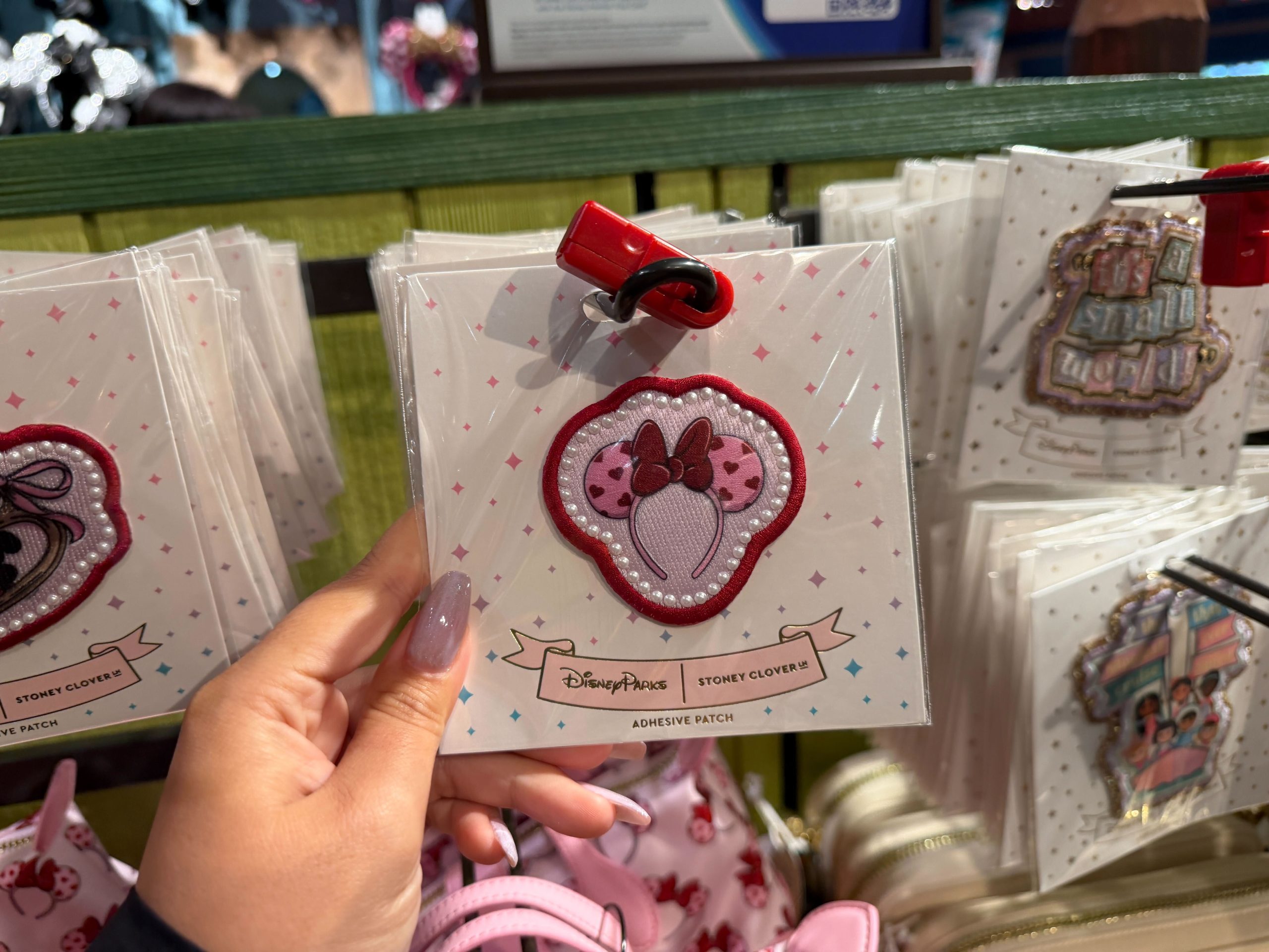 The third patch features a pink and red heart-covered Minnie ear headband.