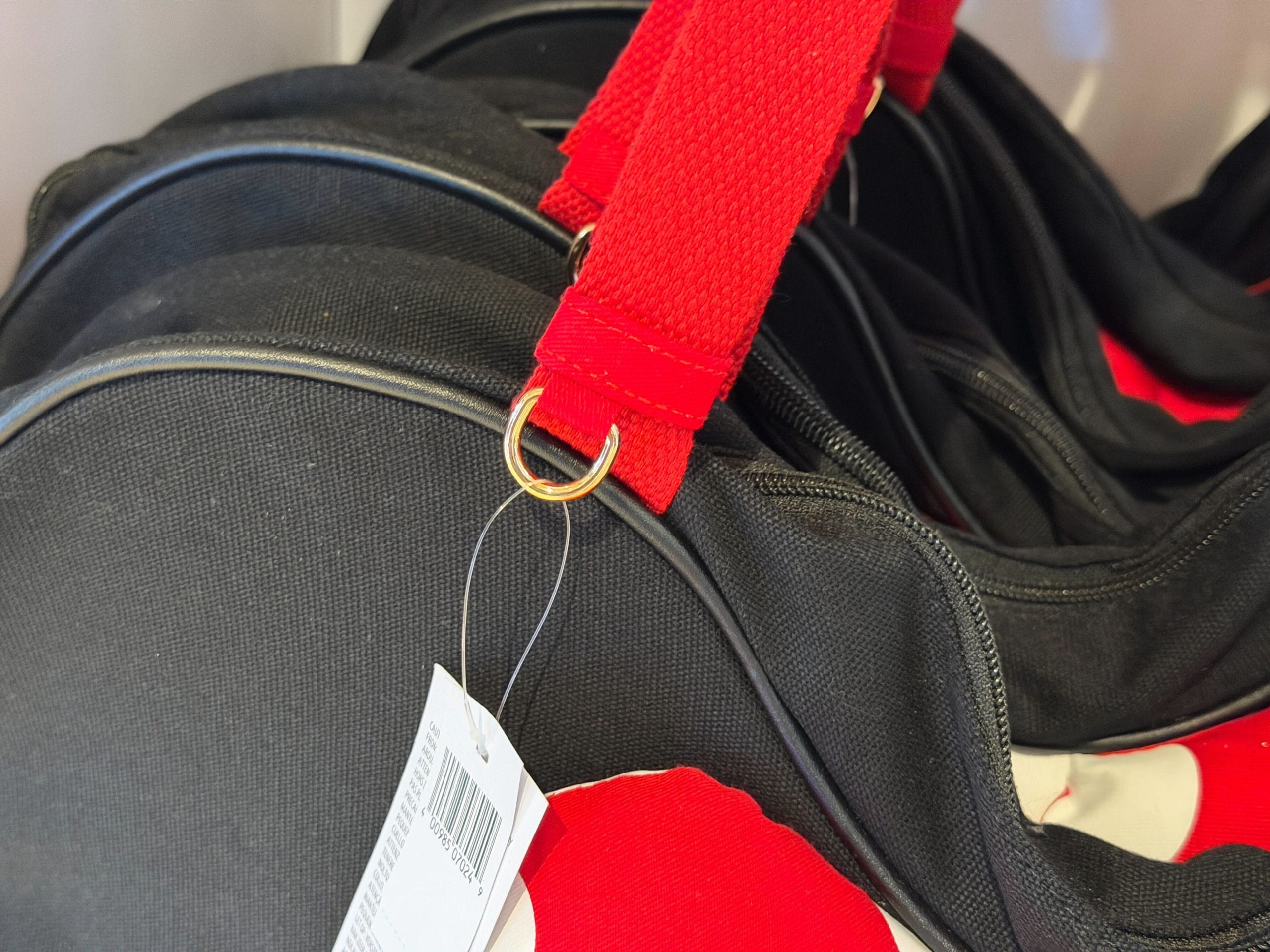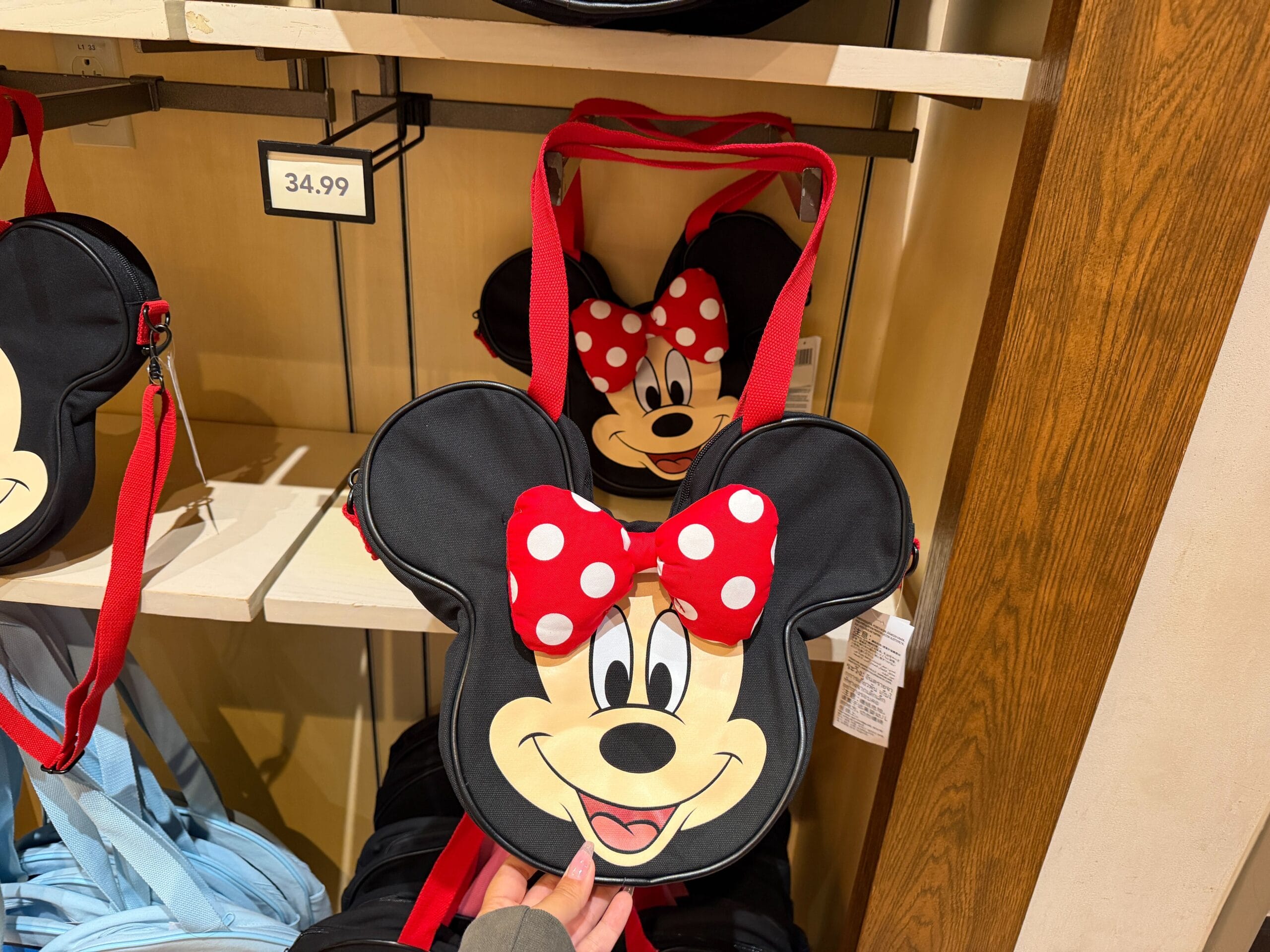 The canvas bag is black with faux leather piping trim. Minnie’s face is screen printed on one side below a 3D polka-dot bow. It has two red shoulder straps.
