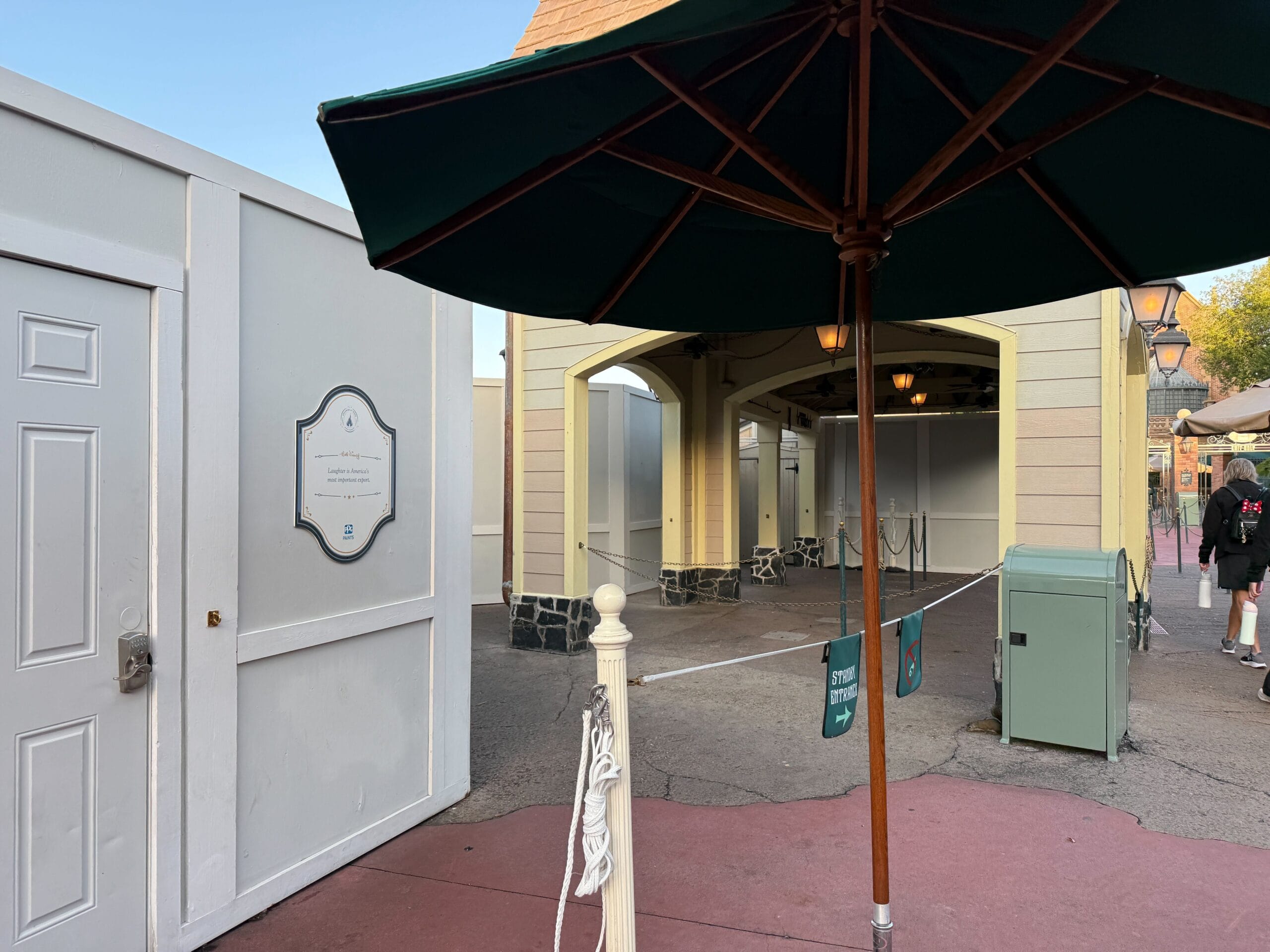 The Keel Boat Landing is next to the entrance of The Haunted Mansion, pictured above. Though the Mike Fink Keel Boats have been closed since 2001, the dock remained and the building was used as an extended queue for The Haunted Mansion. Construction walls went up around part of the building early during Rivers of America demolition.