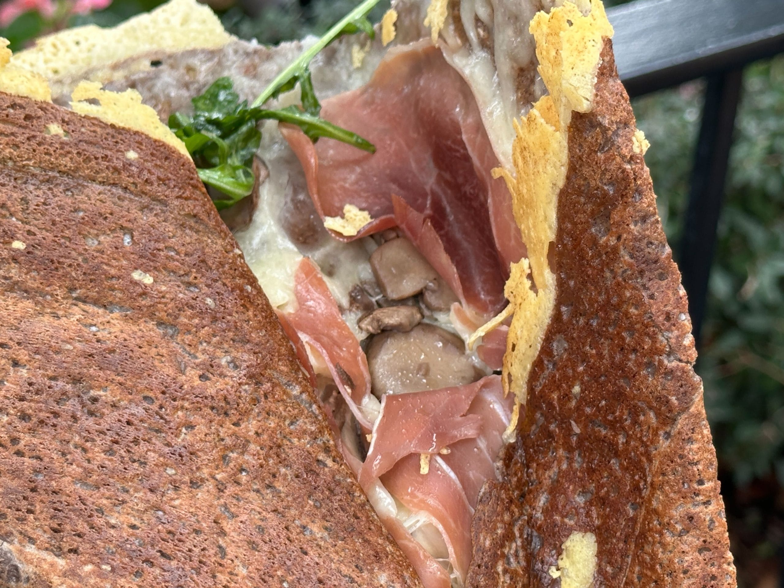 This is really good, it’s just a lot. The savory crepe has a crispy cheese edge, which was amazing. It’s filled with ham, cheese, mushrooms, and arugula.