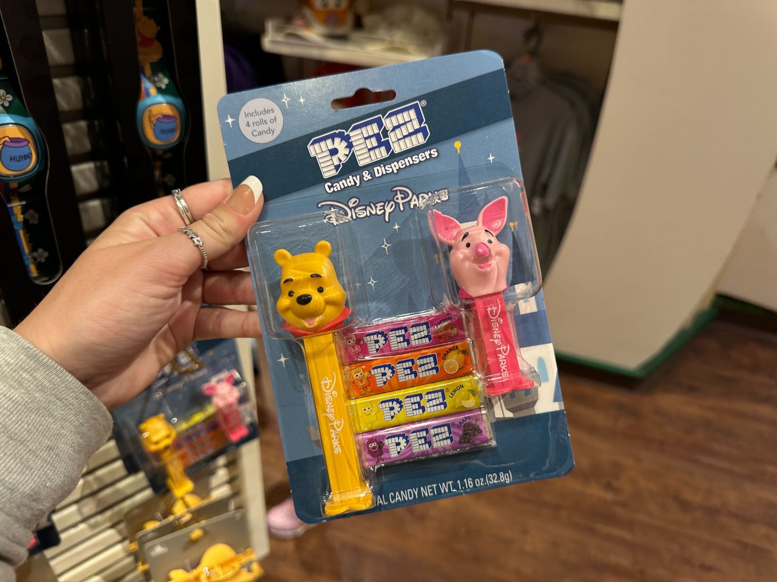 There are two Pez dispensers in this set, which includes four rolls of candy: grape, two lemon, and orange. Pooh’s head sits on top of the yellow dispenser, and Piglet’s head sits on top of the pink one.