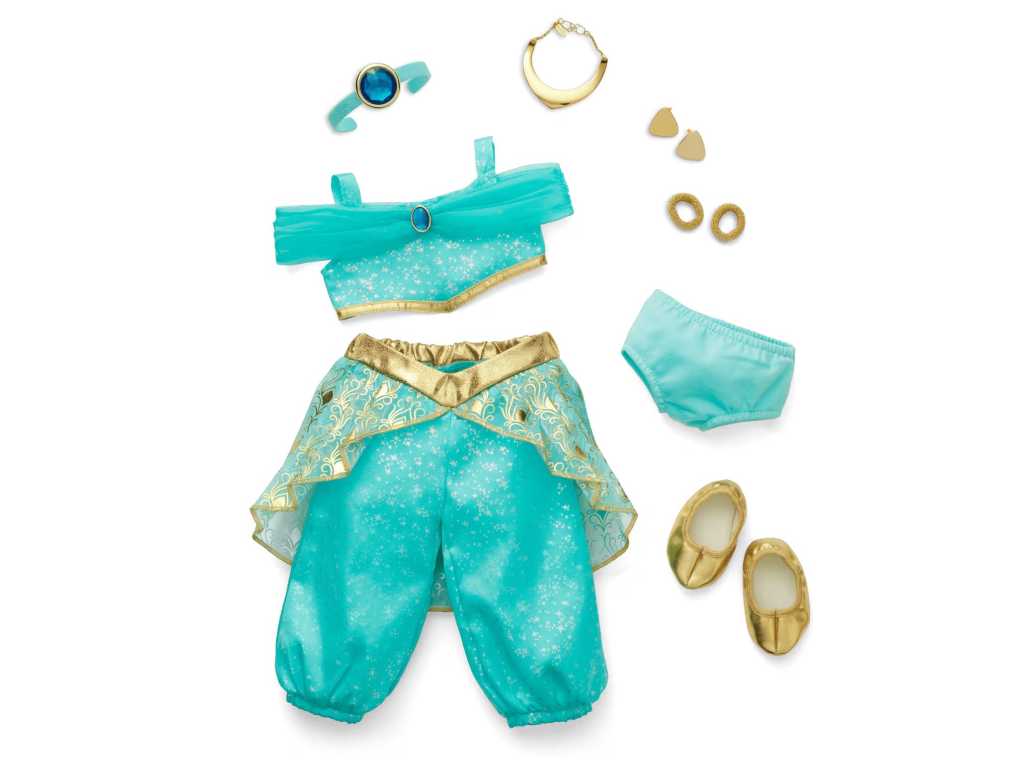 The set also includes her turquoise headband with a large teal faux gem in the center, golden triangular earrings, a golden necklace, two gold-colored hair ties, golden metallic pointed-toe slippers, and cotton underwear.