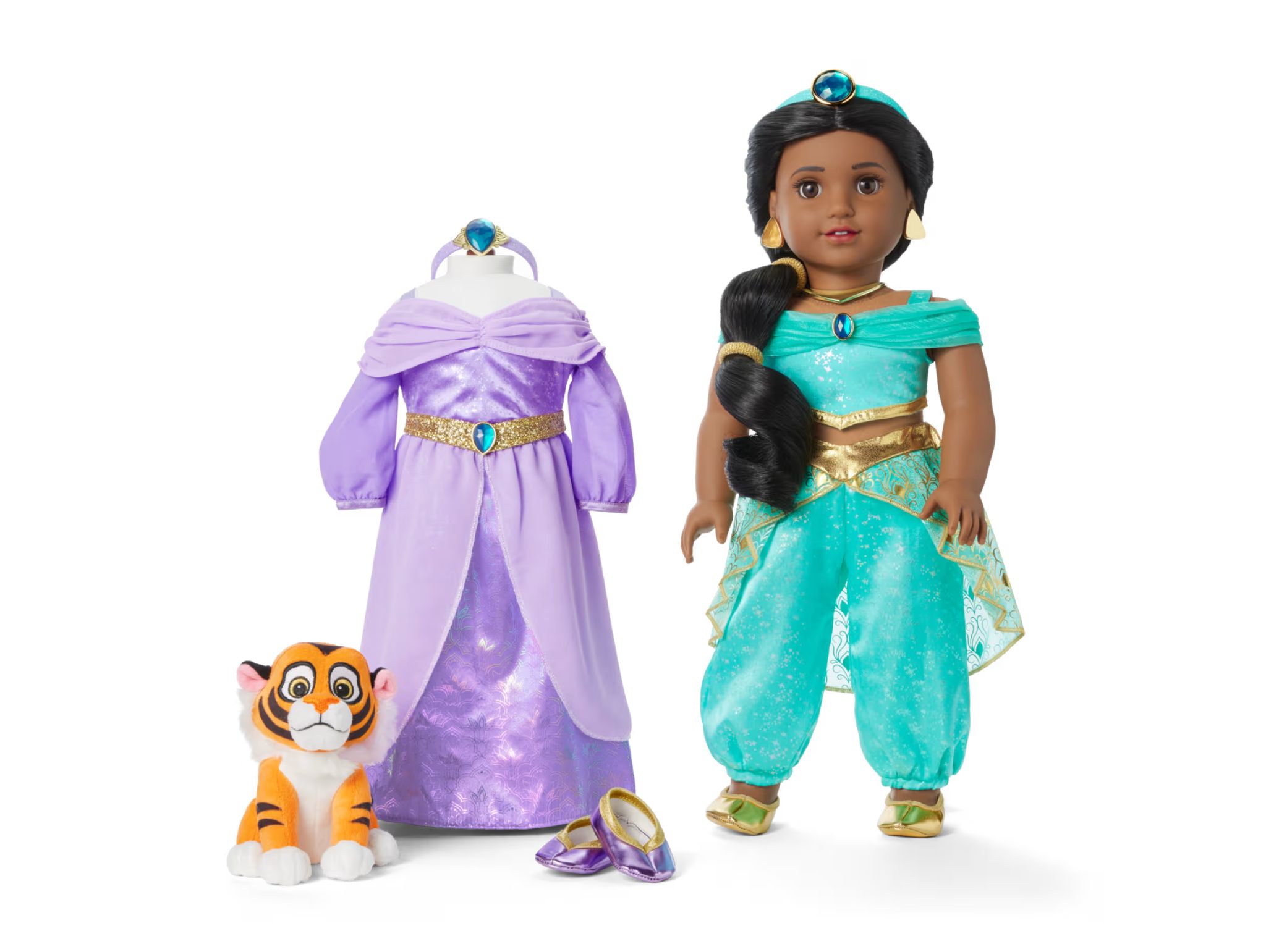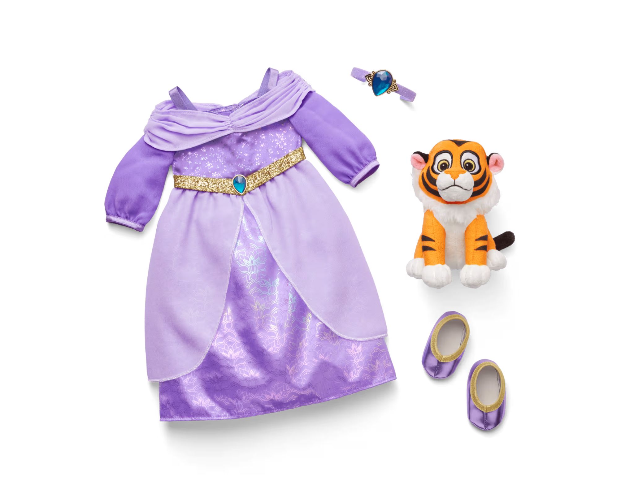 The accessories set includes her lilac satin dress with a sparkle print, chiffon elements, and an attached belt with a teardrop faux gemstone. It’s paired with a glittery purple headband with a faux gem and metallic purple pointed-toe slippers. The Rajah plush depicts him as a cub. This set does not include the doll.