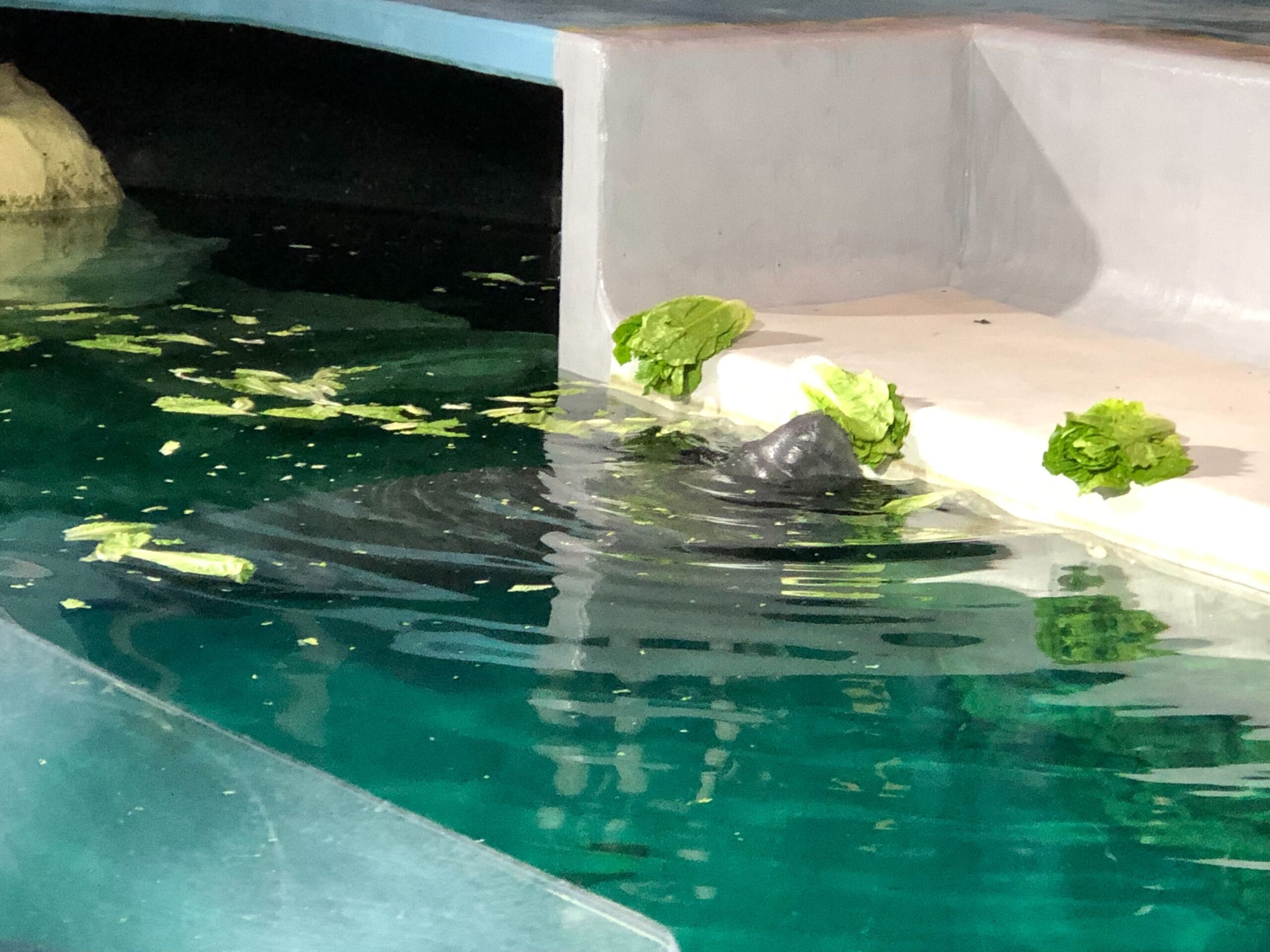 We got our first look at The Seas’ newest manatee swimming and munching Romaine lettuce alongside Tanimura and Cider, the other two manatees currently residing in the aquarium.