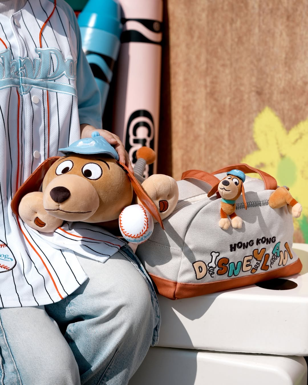 There’s also a duffel bag with “Hong Kong Disneyland” on the side. “Disneyland” is spelled out with colorful letters, some featuring springs. A Slinky Dog plush is attached to the front, his spring embroidered between his front half and back half.