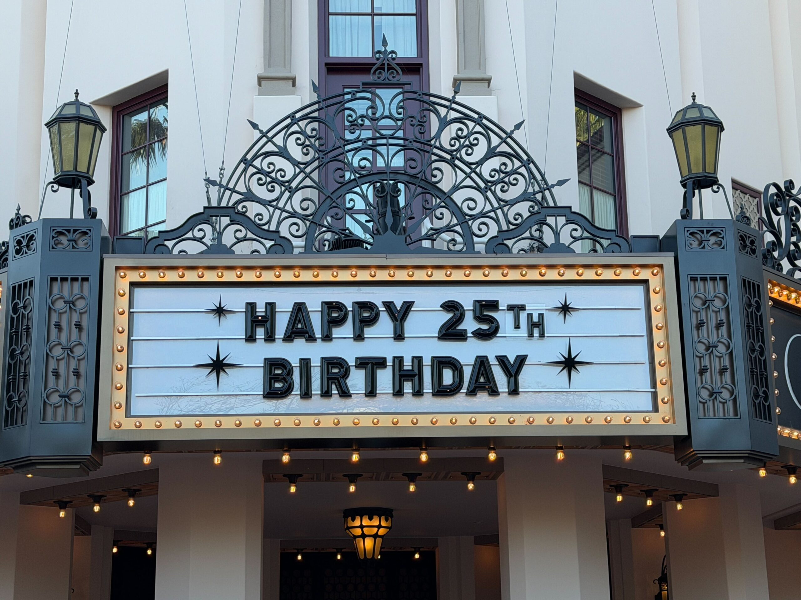 Celebrations have begun for the 25th anniversary of Disney California Adventure, which opened its gates on February 8, 2001. The marquee of Carthay Circle Restaurant, a main icon of the park, wishes the park a happy 25th birthday.