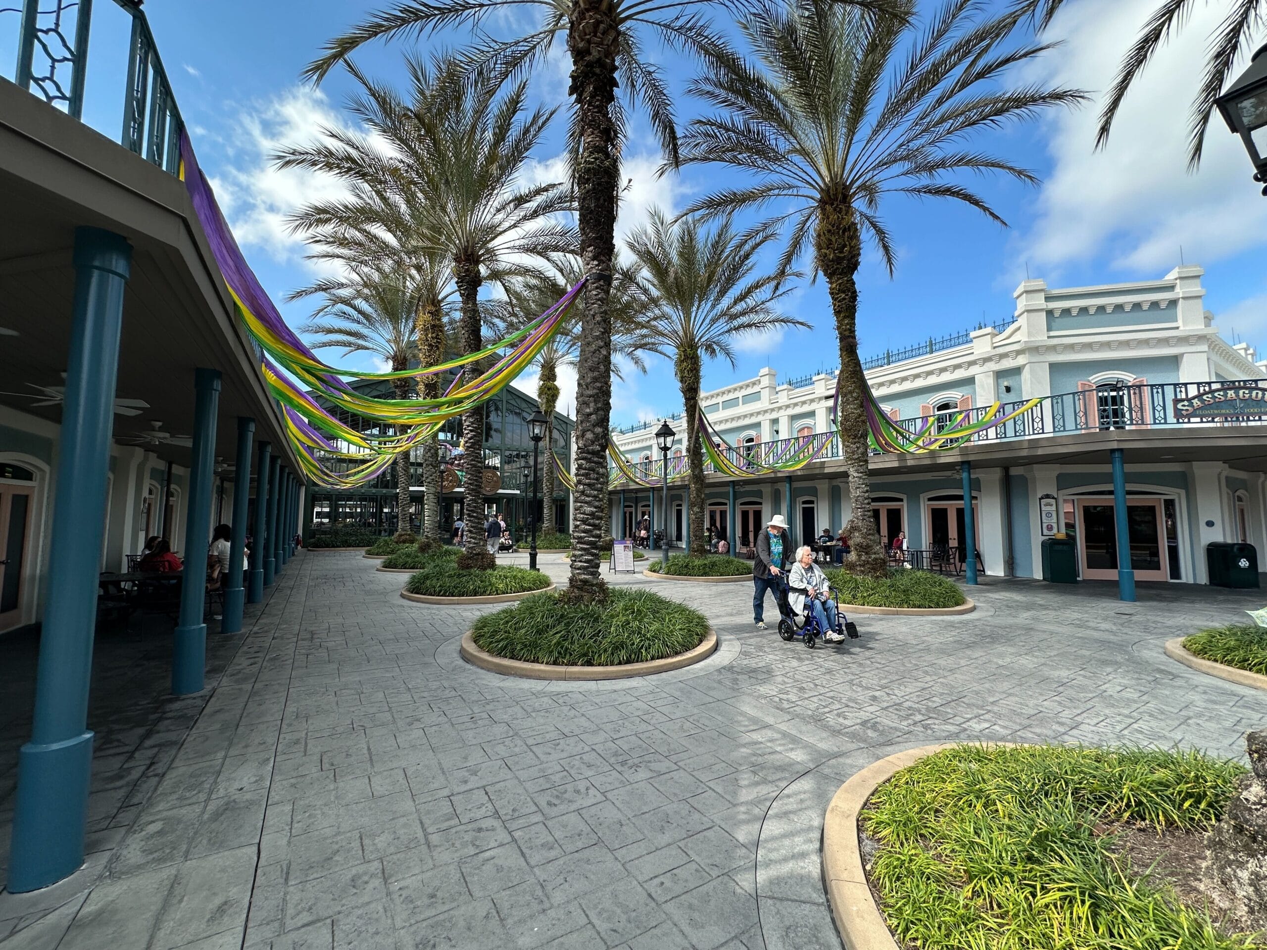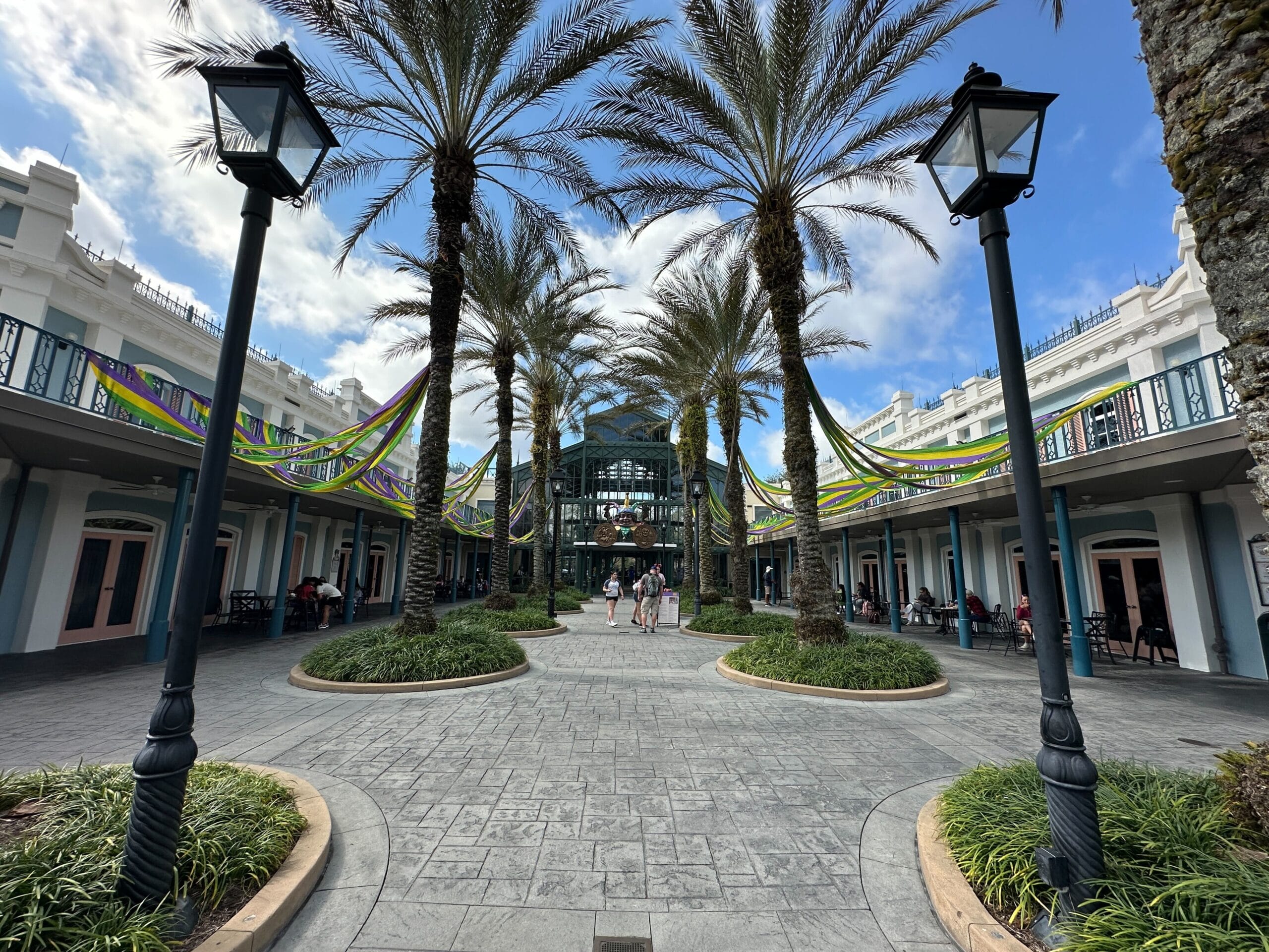 Though the resort has Mardi Gras decorations year-round, extra decor is added to the courtyard for the real Fat Tuesday. Green, gold, and purple streamers hang above the resort’s courtyard area.