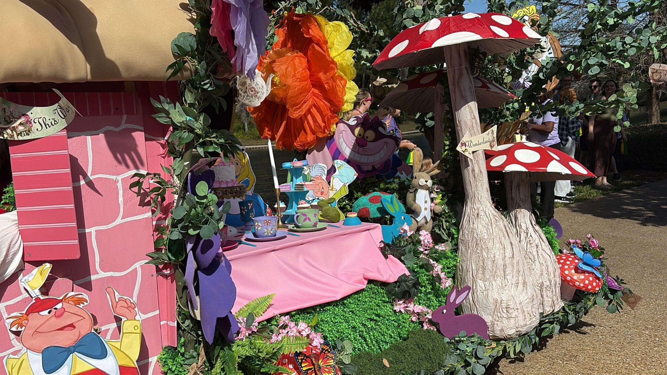 The elaborate float showed the scene from the film in which Alice is stuck in the house after growing too large. Behind the house, the Mad Hatter is having his tea party, surrounded by mushrooms and oversized flowers.