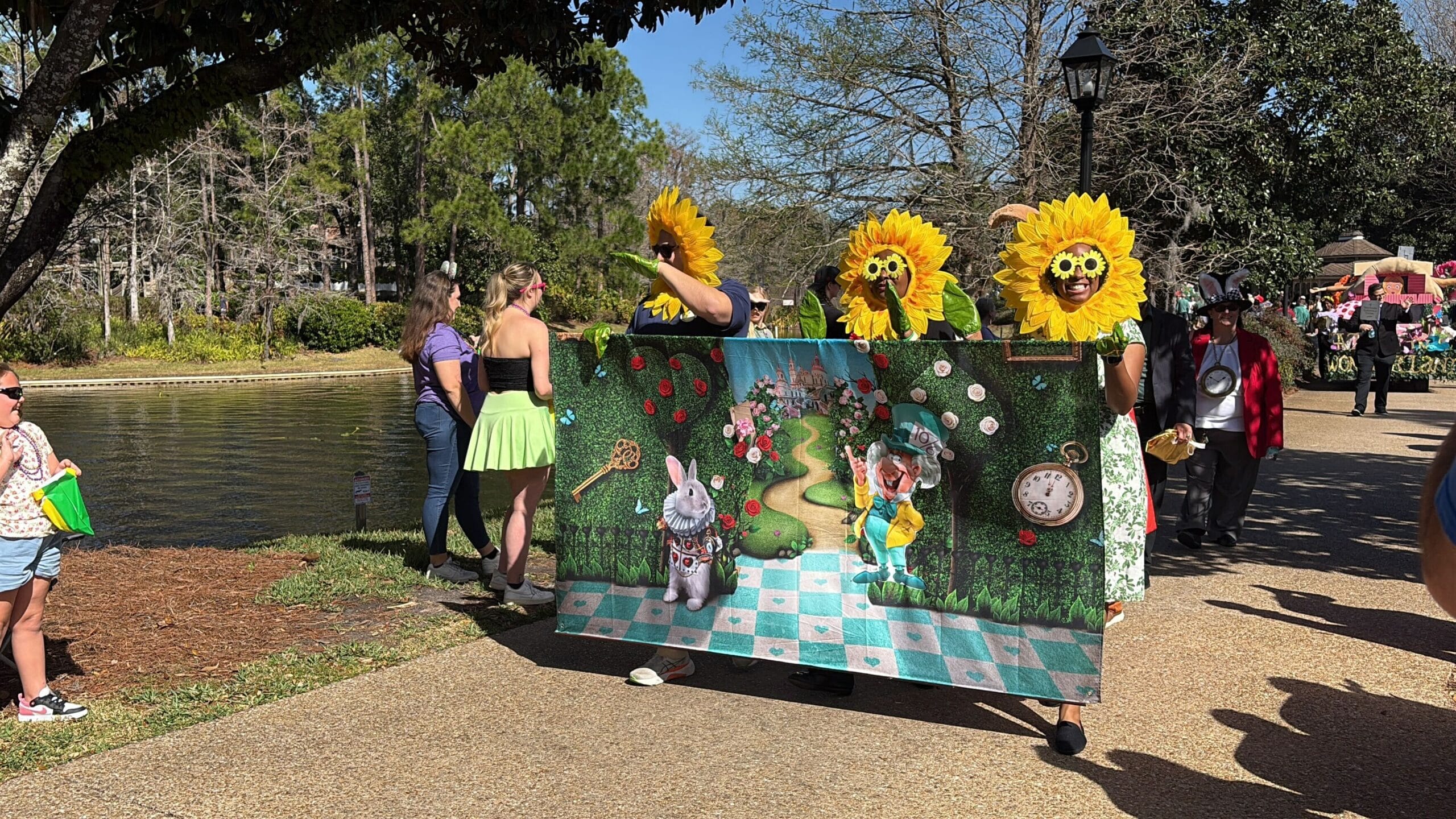 For the Alice in Wonderland float, Cast Members carried a banner with characters on it, like the White Rabbit and the Mad Hatter, while dressed as flowers. Other Cast Members followed along dressed as Alice, the Mad Hatter, and the White Rabbit.