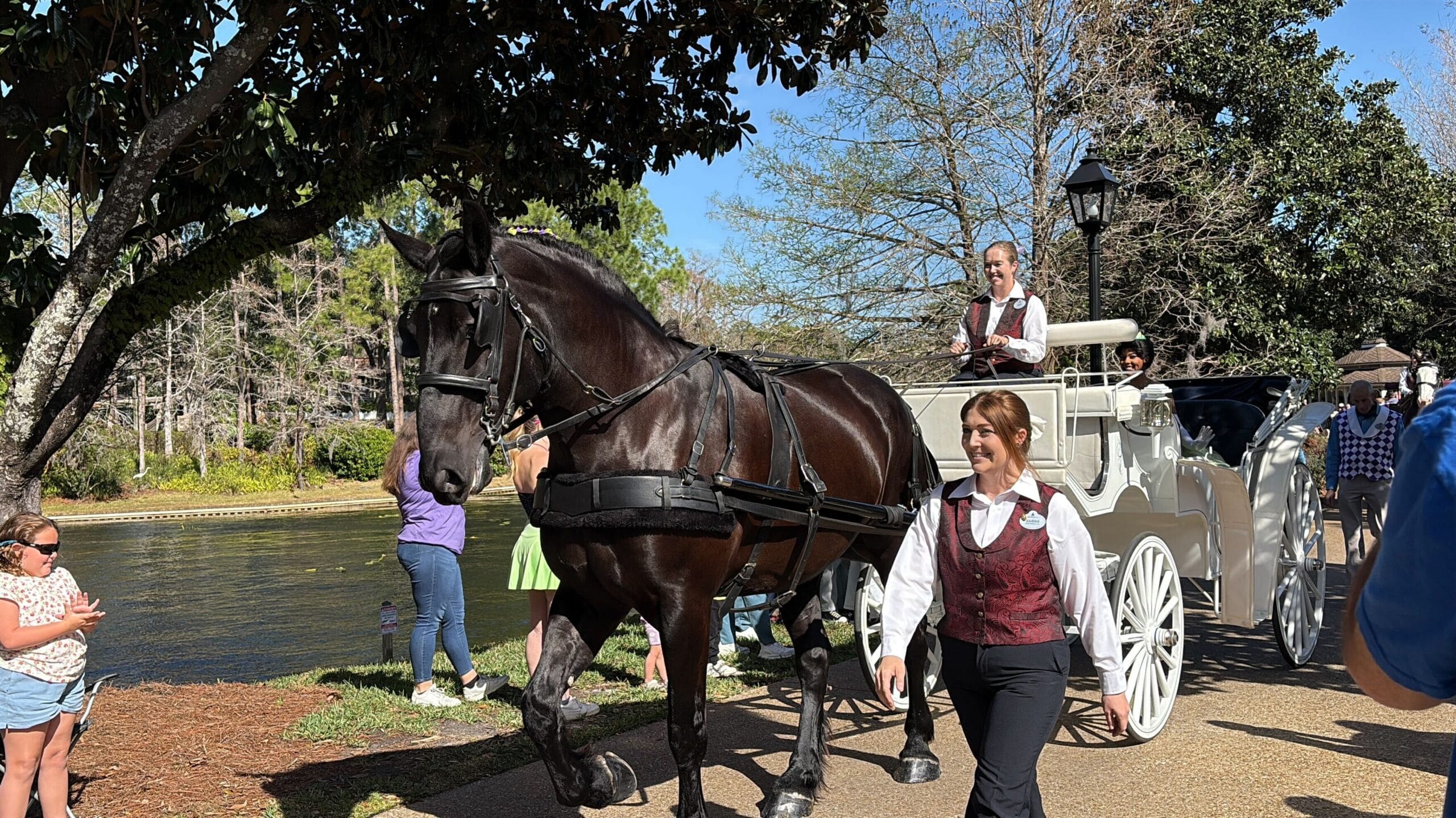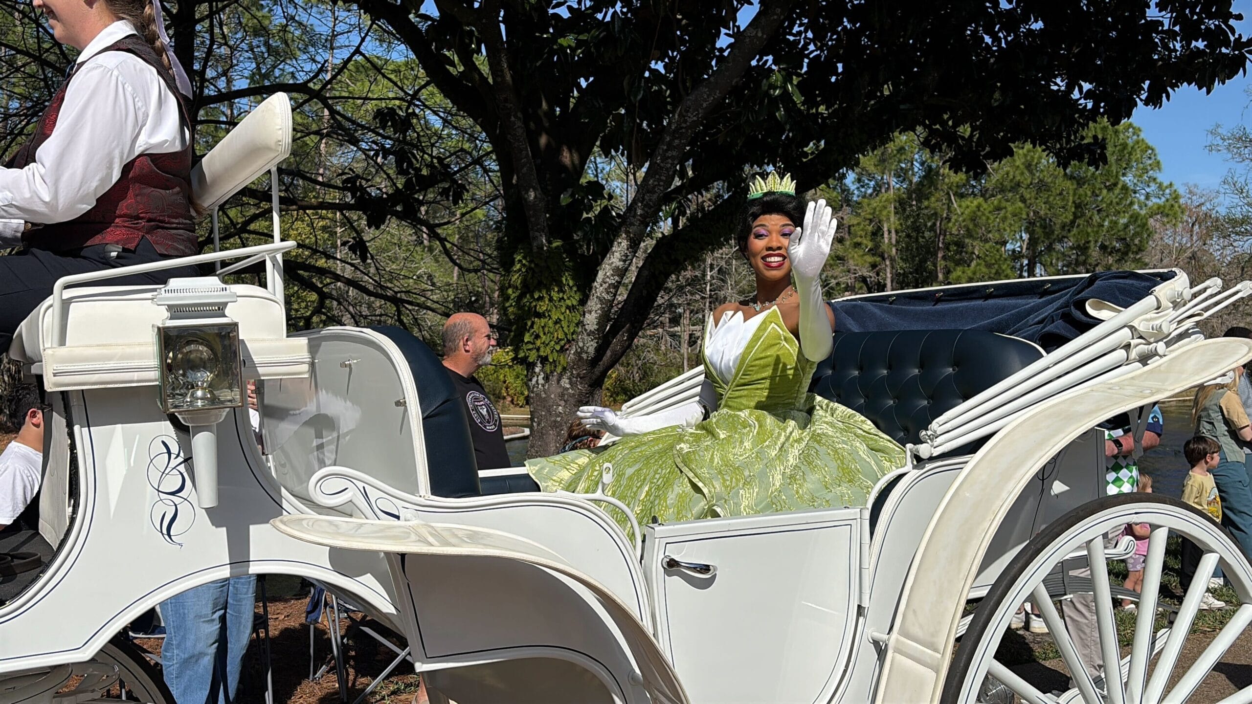 In a horse-drawn white carriage, Princess Tiana greeted onlookers.
