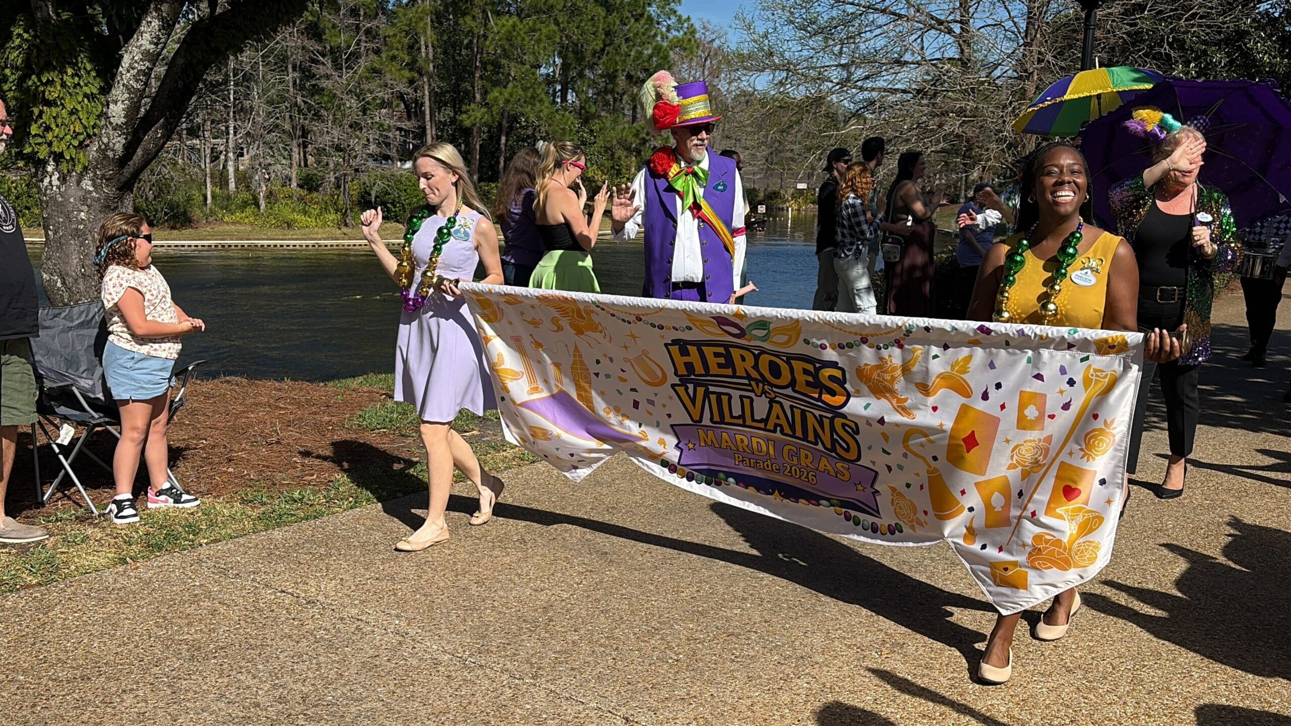 This year’s Mardi Gras parade theme was Heroes v.s. Villains, as indicated by the starting banner.