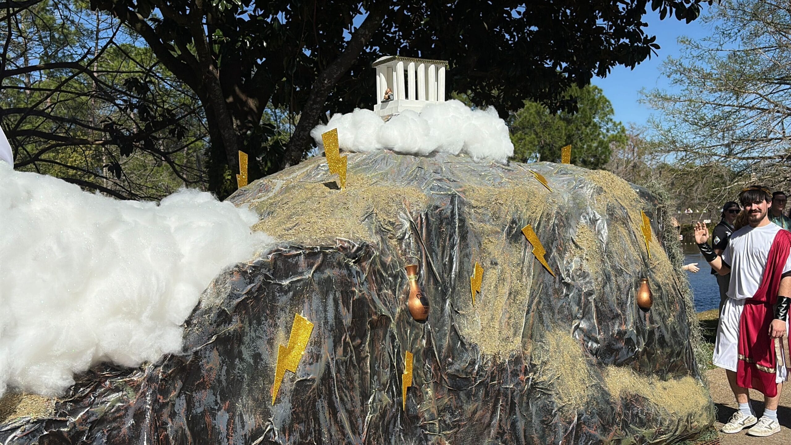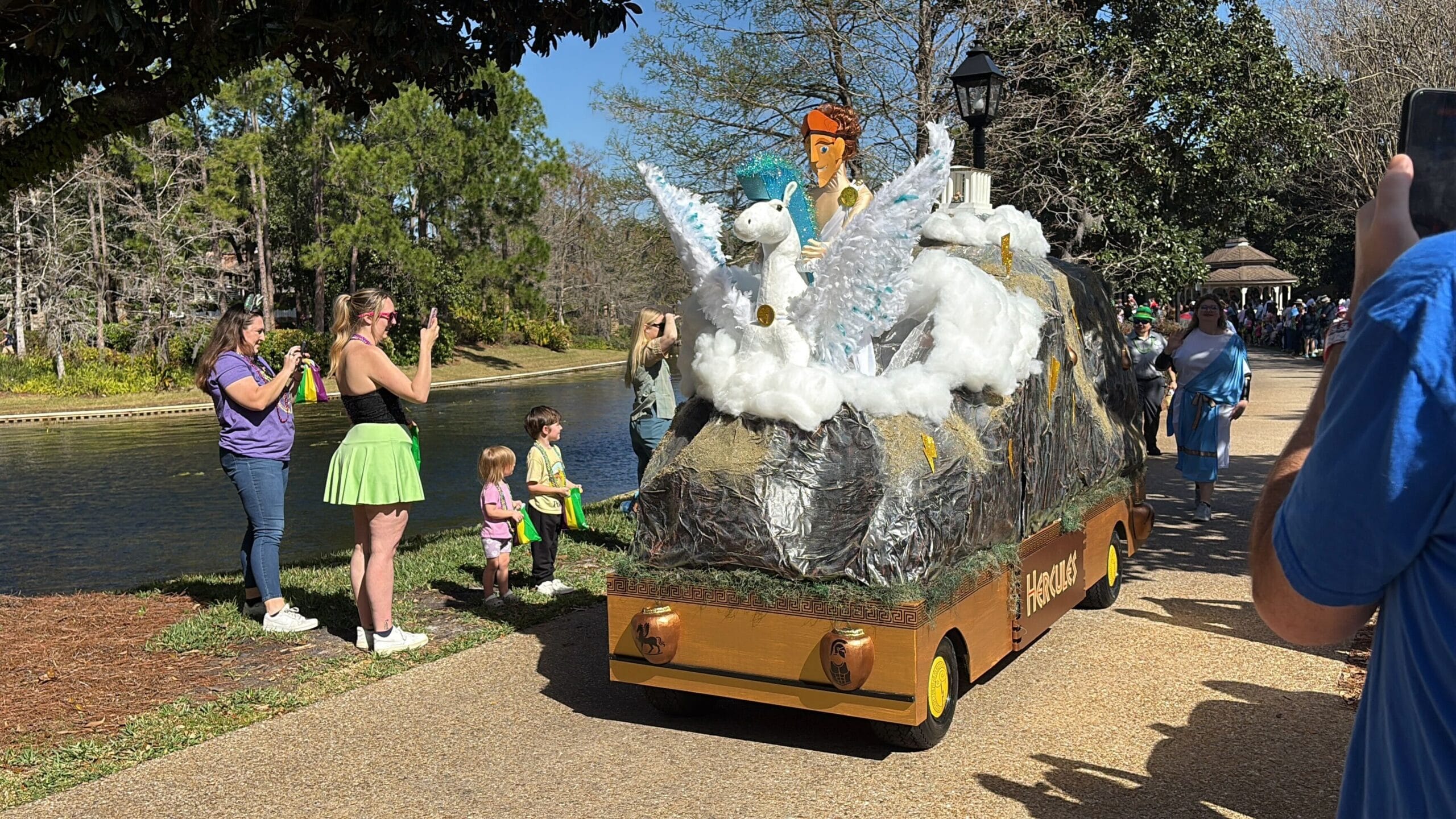 On the float, we saw Hercules riding Pegasus, flying away from Zeus’ Temple, surrounded by lightning bolts.