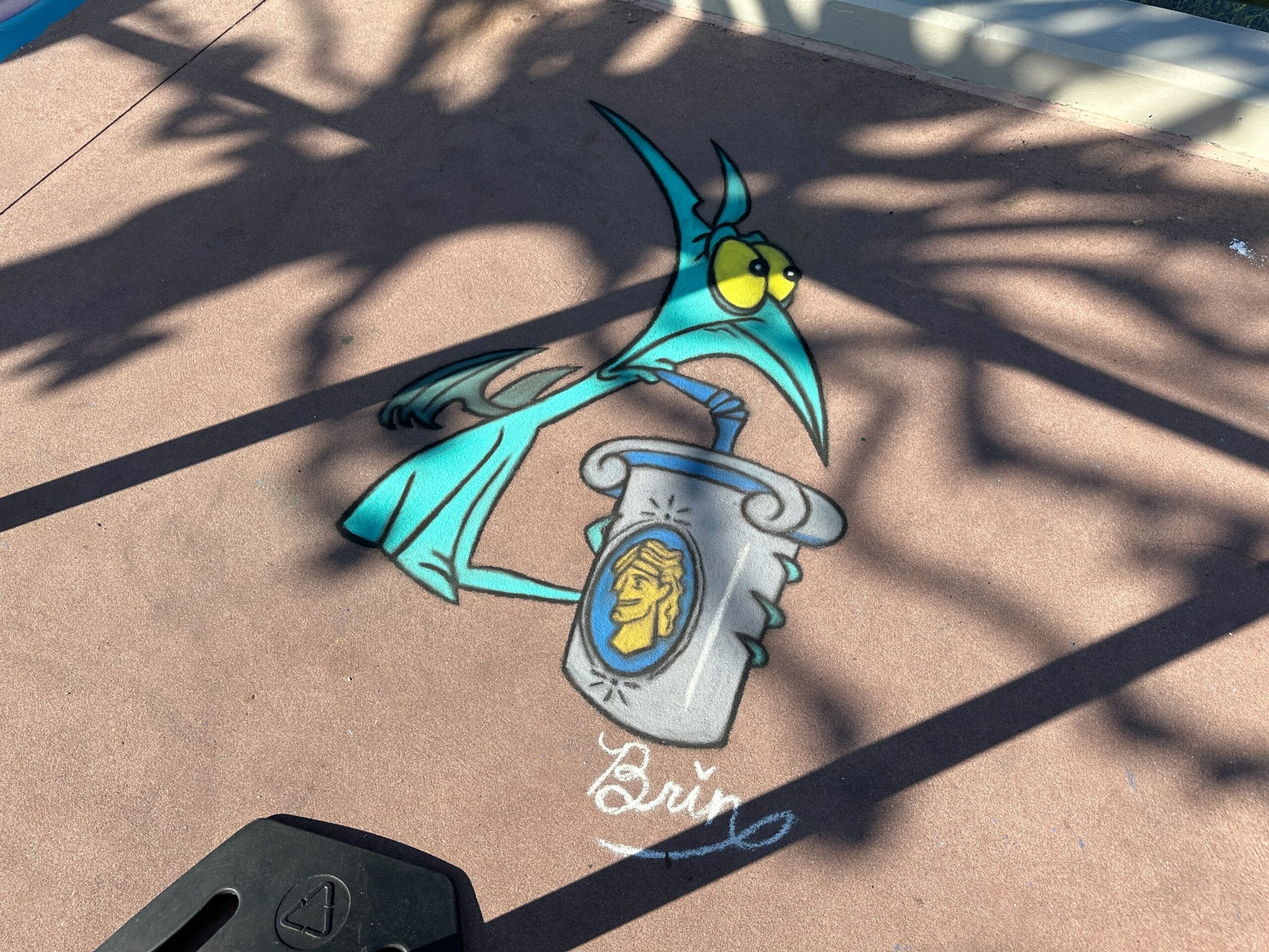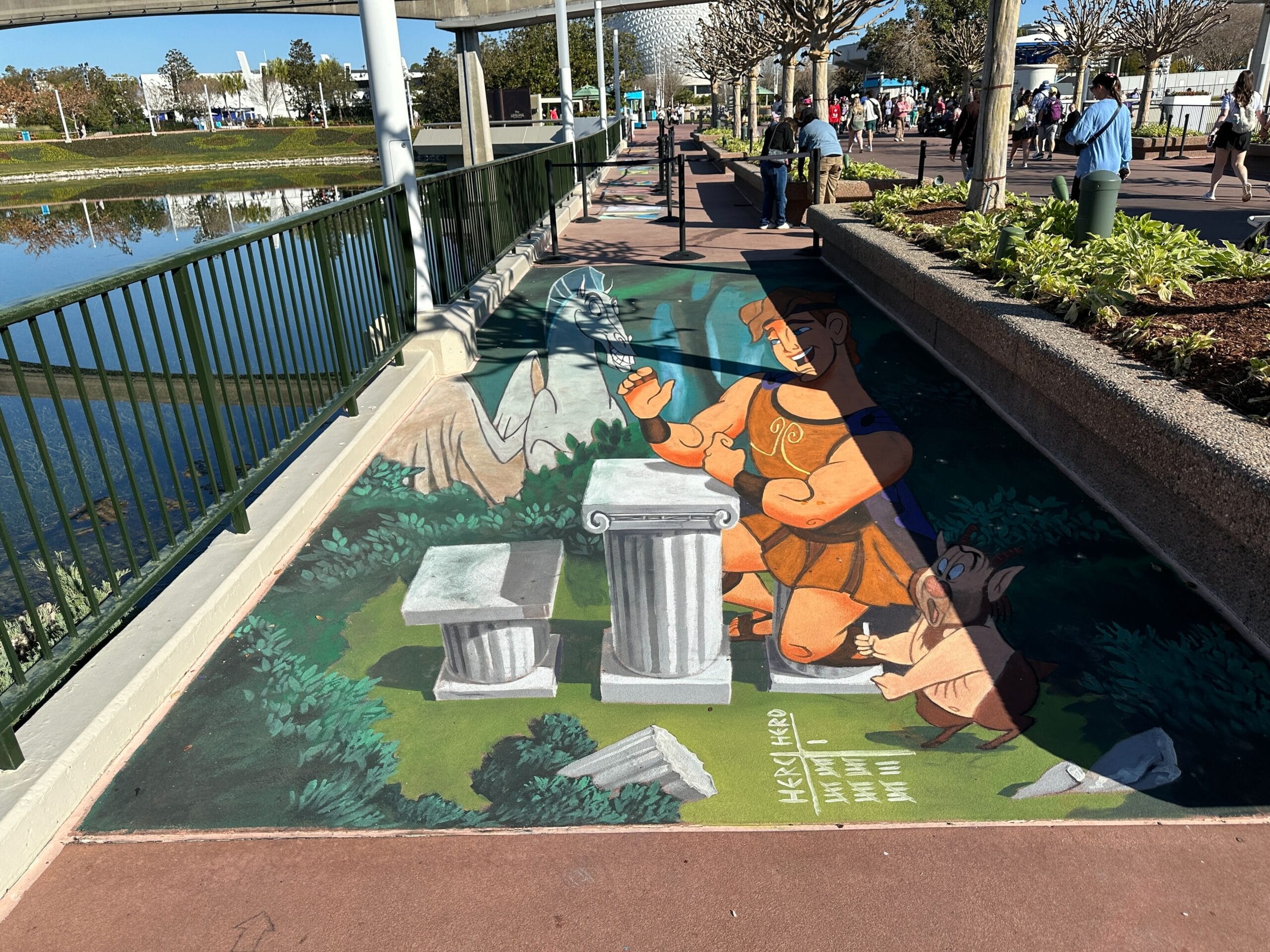 The new perspective-shifting photo op chalk art is inspired by Hercules. The hero is pictured ready to arm wrestle and guests can pose alongside him. Phil and Pegasus are also in the artwork, Phil keeping score.