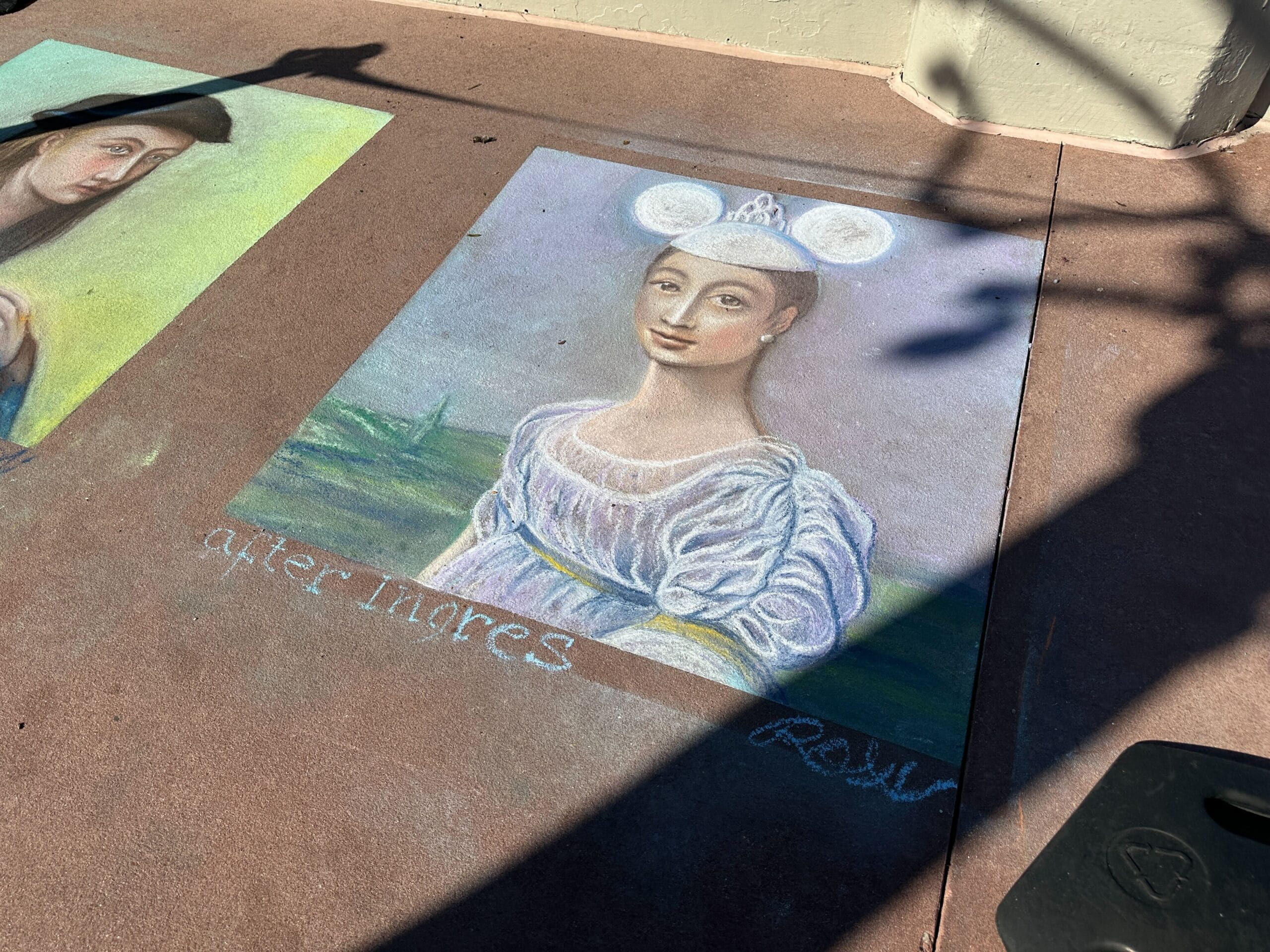 Other chalk art includes Mickey twists on classic works. These “after Raphael” and “after Ingres” pieces add hidden Mickeys and a Mickey ear hat.