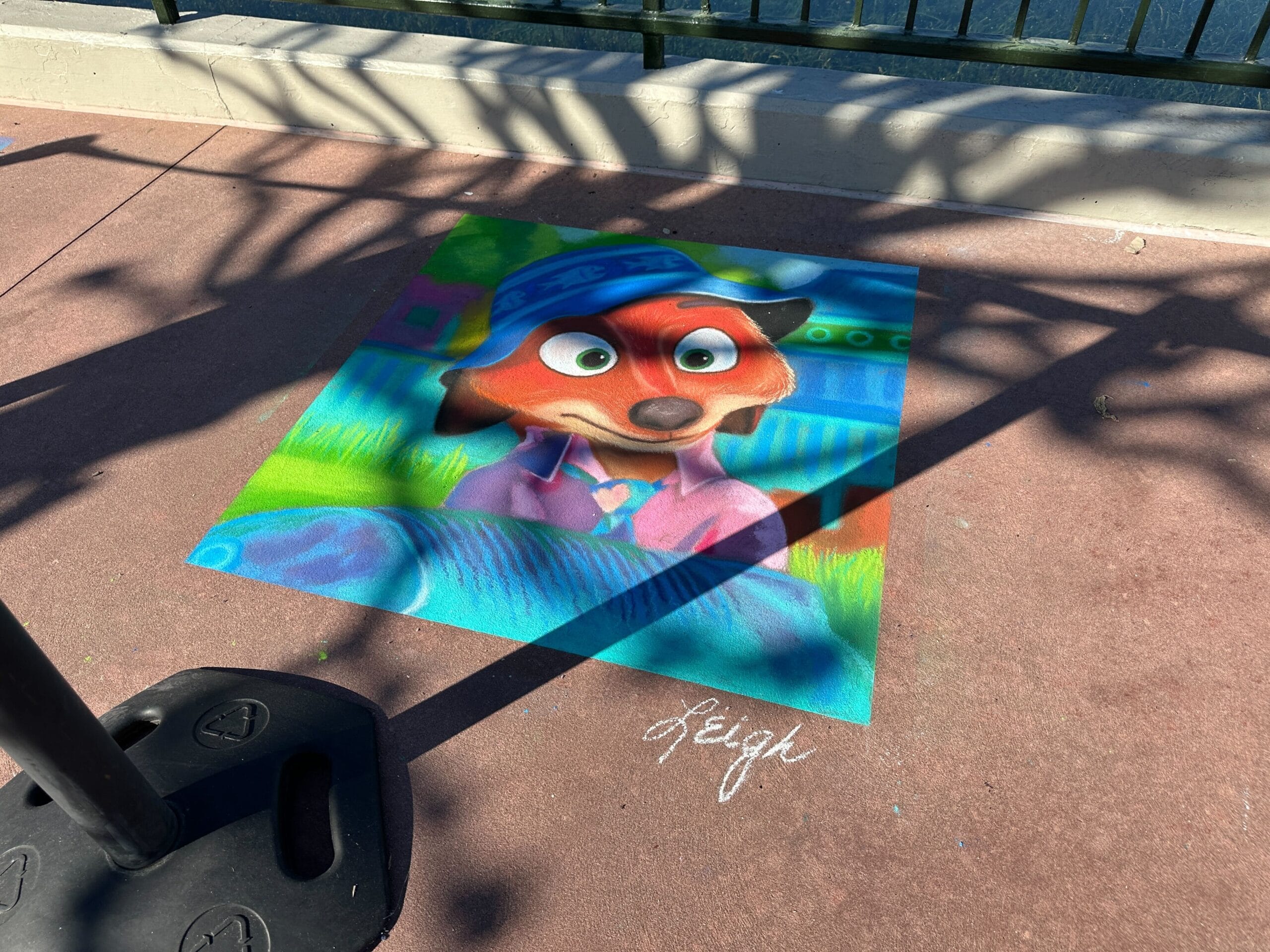 Inspired by Zootopia 2, this piece by artist Leigh features Nick Wilde in his bucket hat disguise holding a large fish.