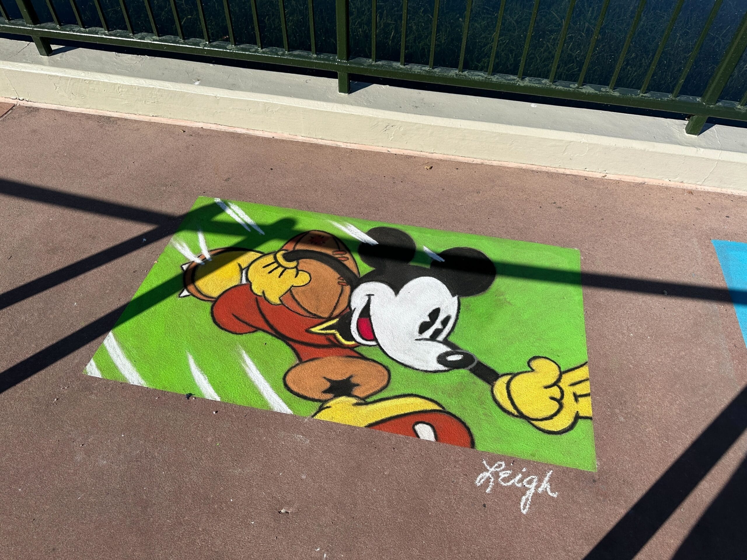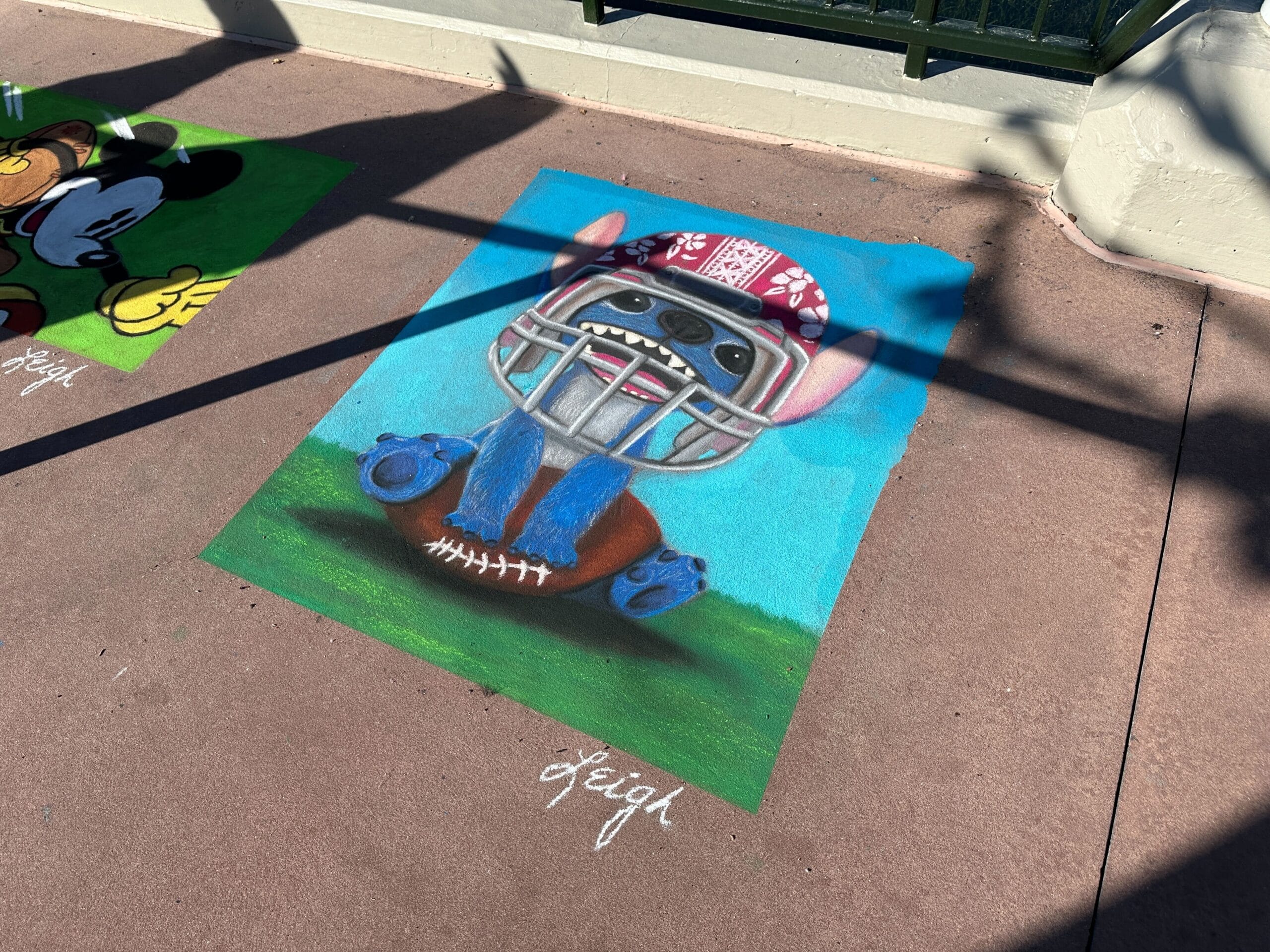 For Super Bowl weekend, Leigh drew Stitch in a hawaiian-patterned helmet holding a football. Leigh also drew Mickey running with a football under his arm.