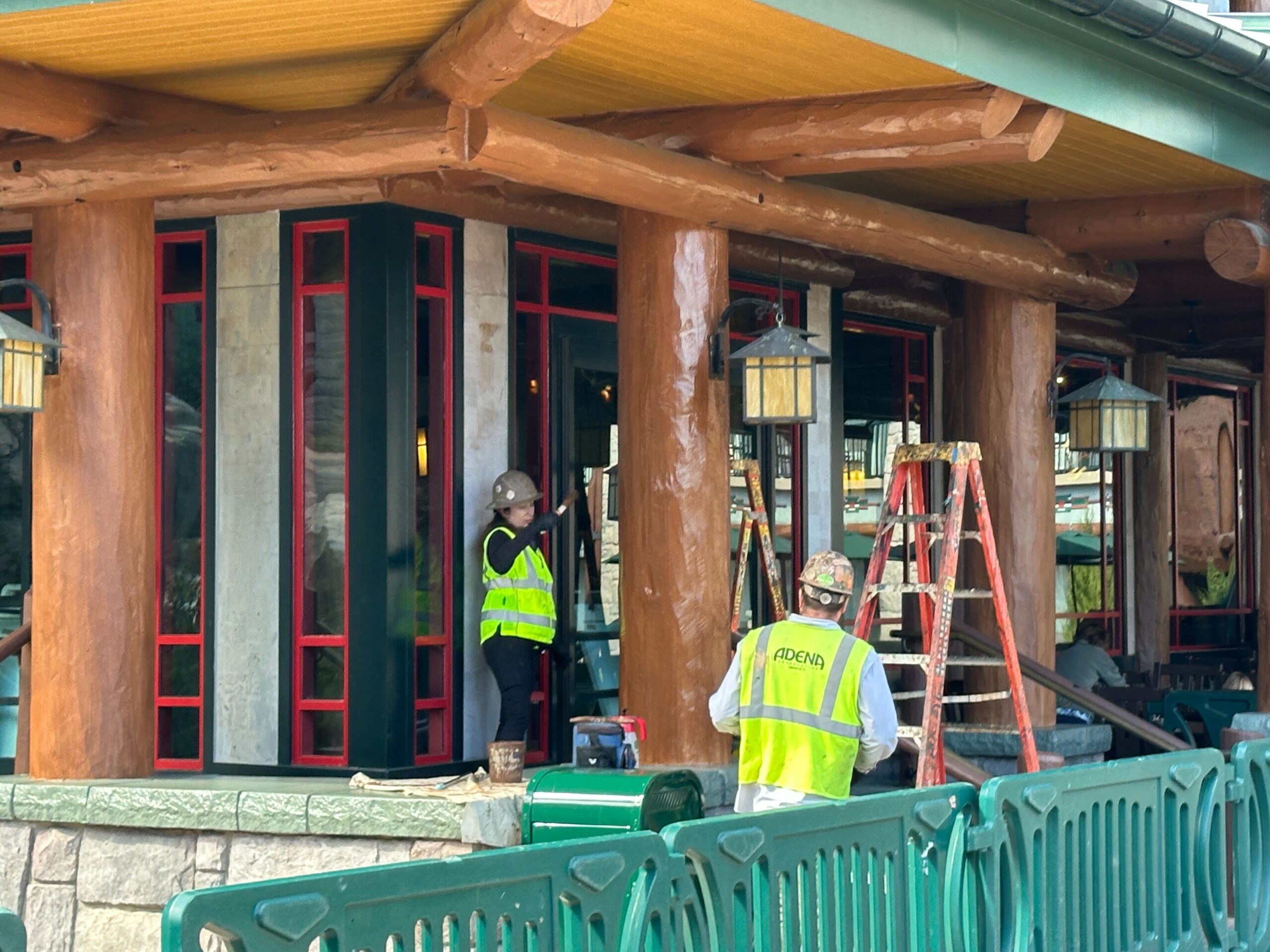 Below, a crew member was repainting one of the wood-style columns.