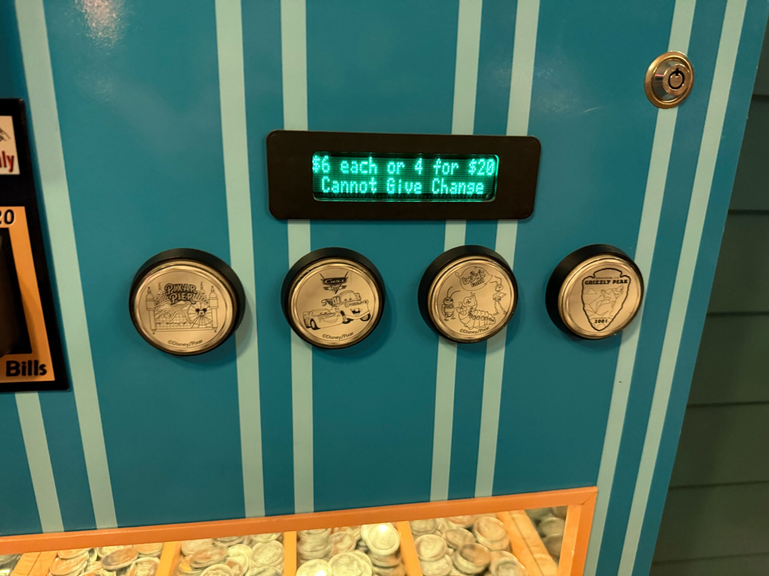 Standard medallions are $6 each with cash only. A set of all four in a machine is $20 with cash, card, or tap to pay. The colored medallions are $8 each or $30 for a full set.