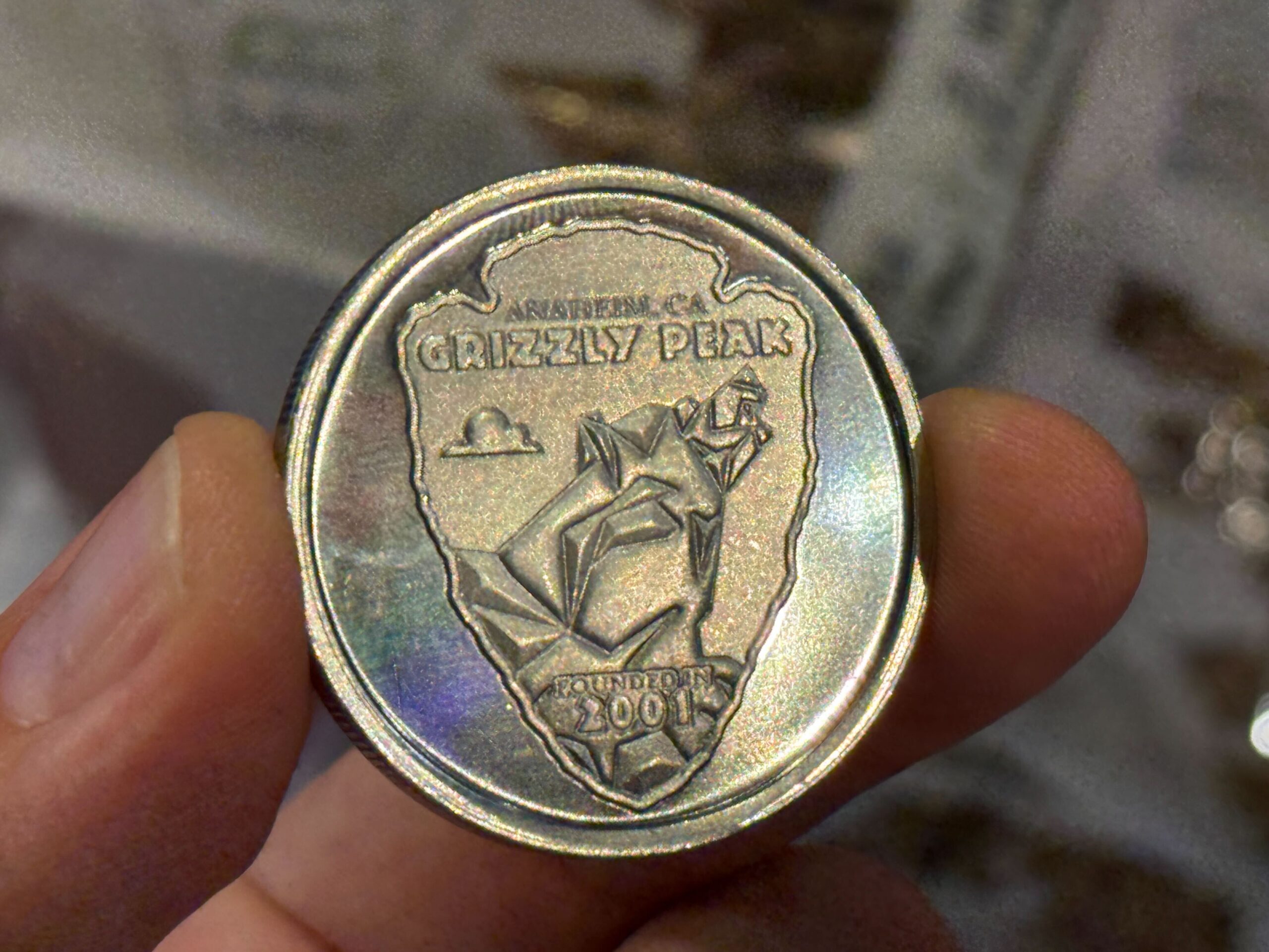 An arrowhead design features Grizzly Peak with “Founded in 2001” text against the iconic bear-shaped mountain.
