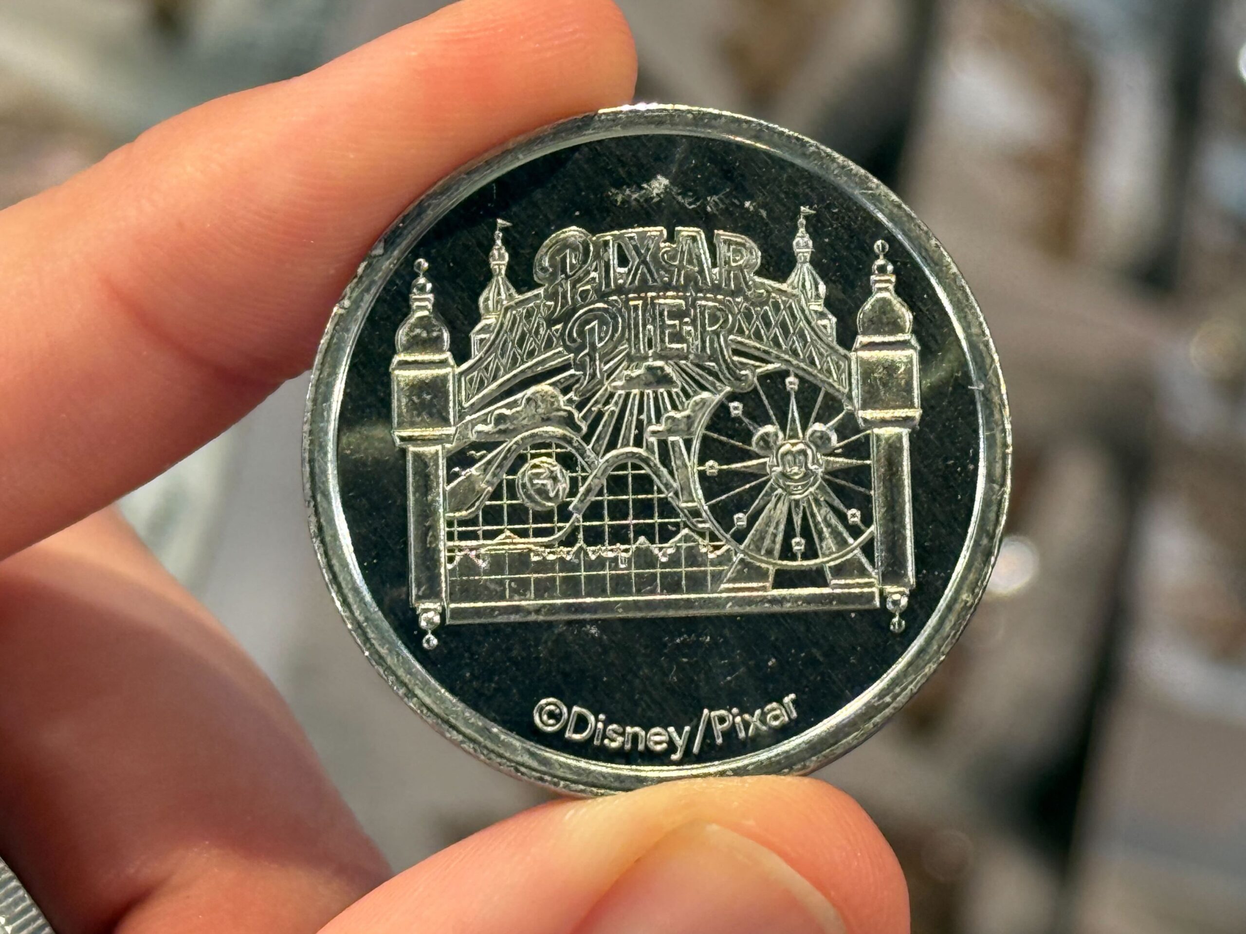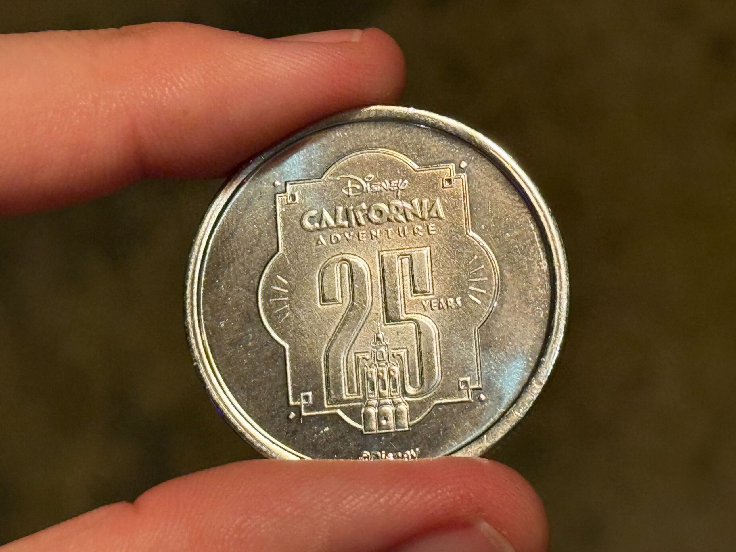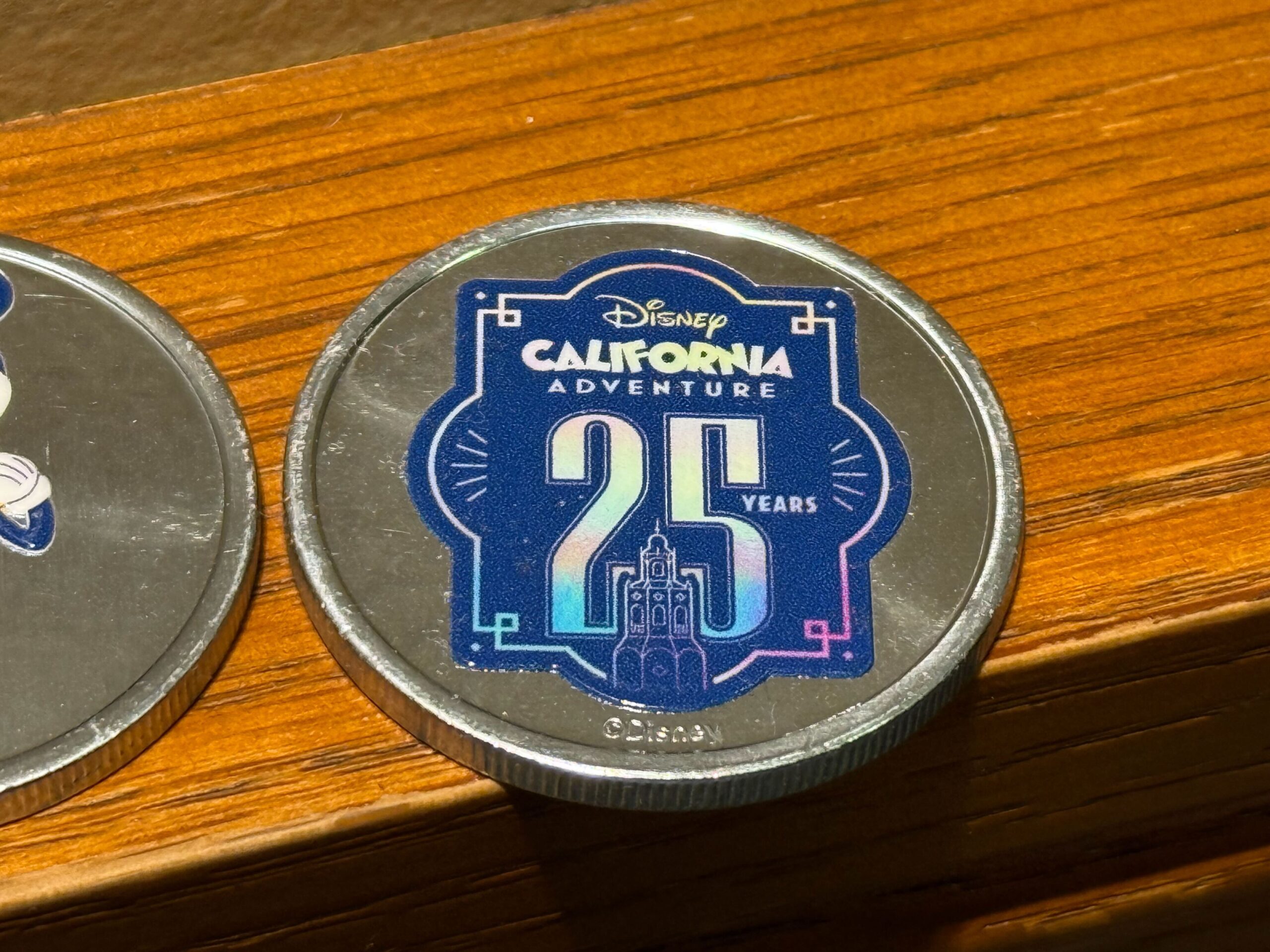All the standard silver medallions have this etched Art Deco design with the Disney California Adventure wordmark, “25 Years,” and the Carthay Circle tower.