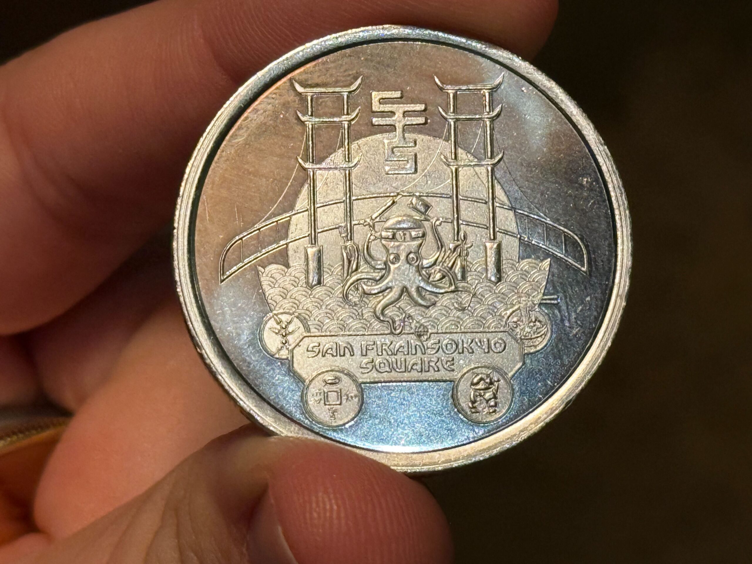 The 25th anniversary medallion of course represents San Fransokyo Square. The octopus sushi chef from a San Fransokyo sign is pictured in the center against the Torii Gate Bridge. More San Fransokyo Square icons are around the land’s name at the bottom.