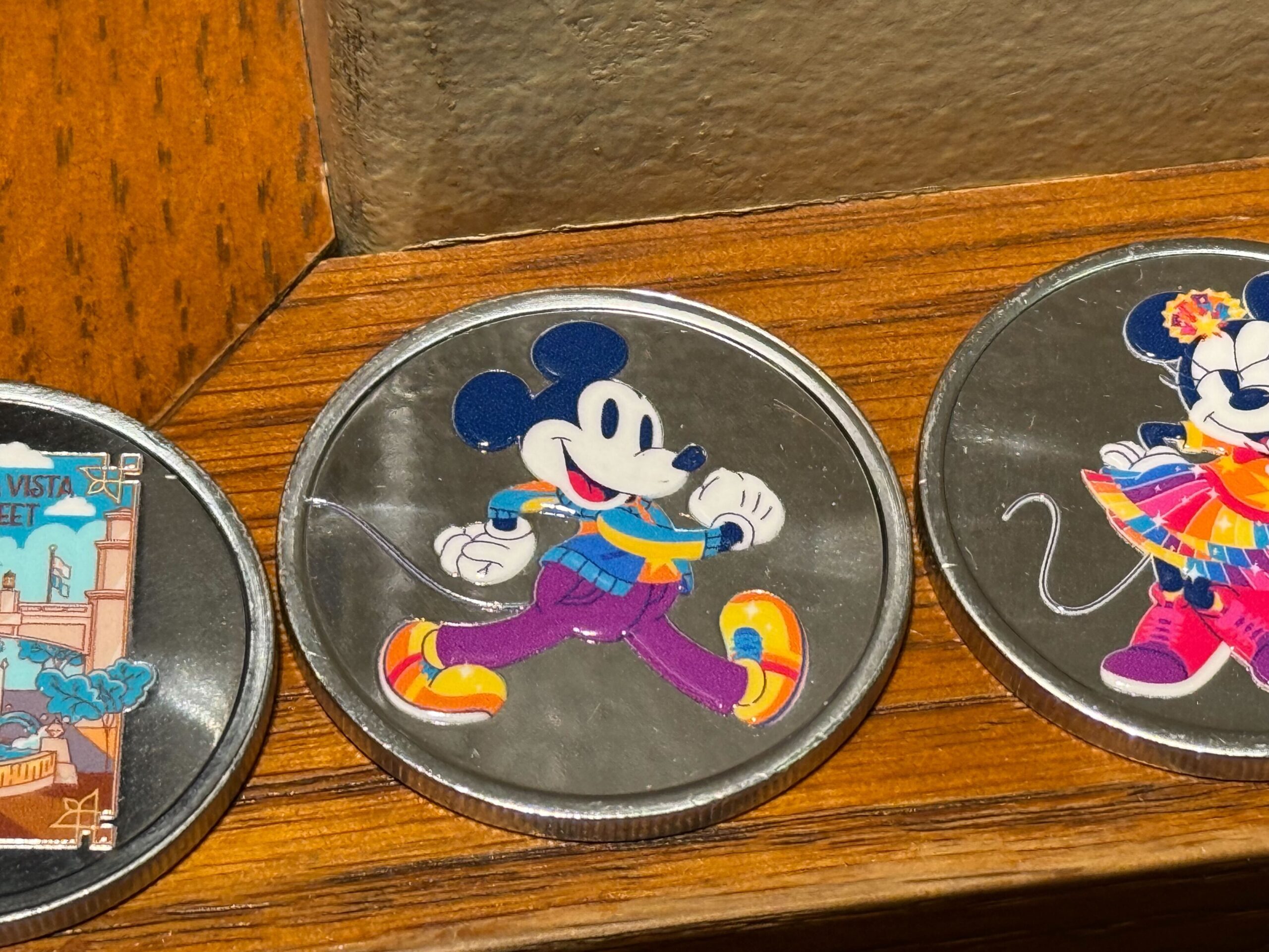 Mickey is pictured in his 25th anniversary outfit on another medallion. He wears a vibrant, colorful costume including a blue jacket, orange t-shirt, and purple pants.