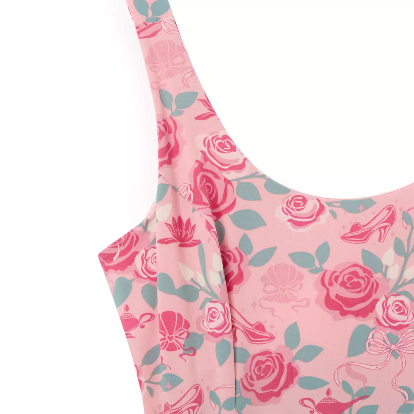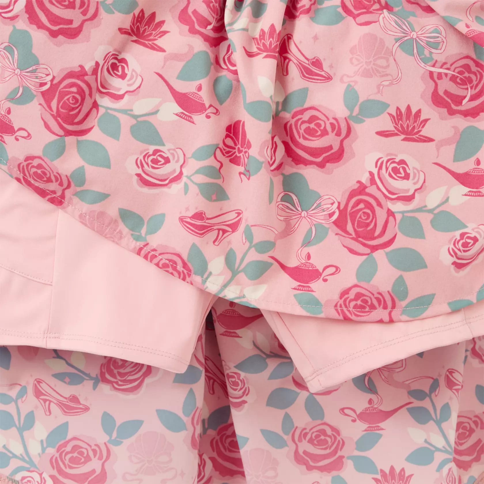 This light pink athletic dress has an all-over print of dark pink roses, sage green leaves, and pink bows. Within the print are icons representing different Disney Princesses: seashells (Ariel), magic lamps (Jasmine), glass slippers (Cinderella), and waterlilies (Tiana).