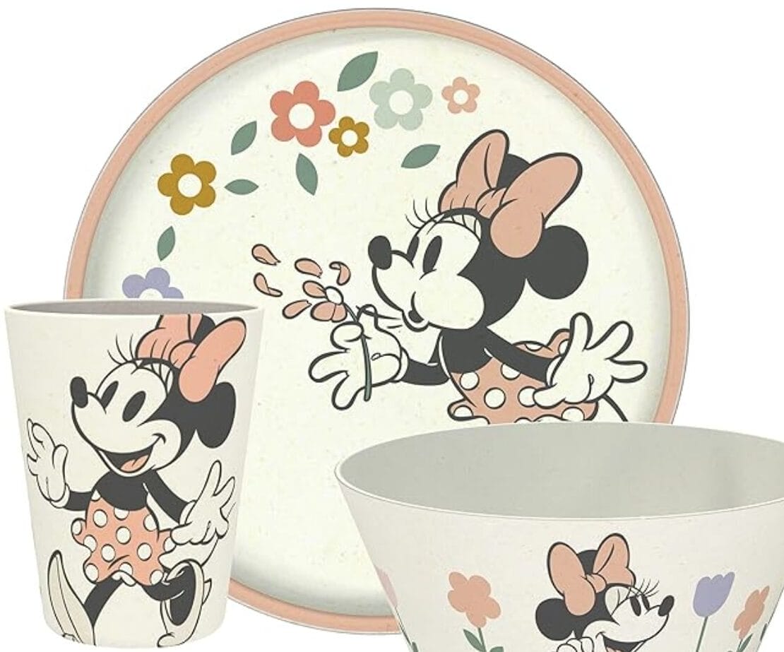 This dinnerware three-pack all features Minnie Mouse in various poses. It comes with a cup, bowl, and plate. They are made from melamine and bamboo, and all are dishwasher safe, but not microwave safe.