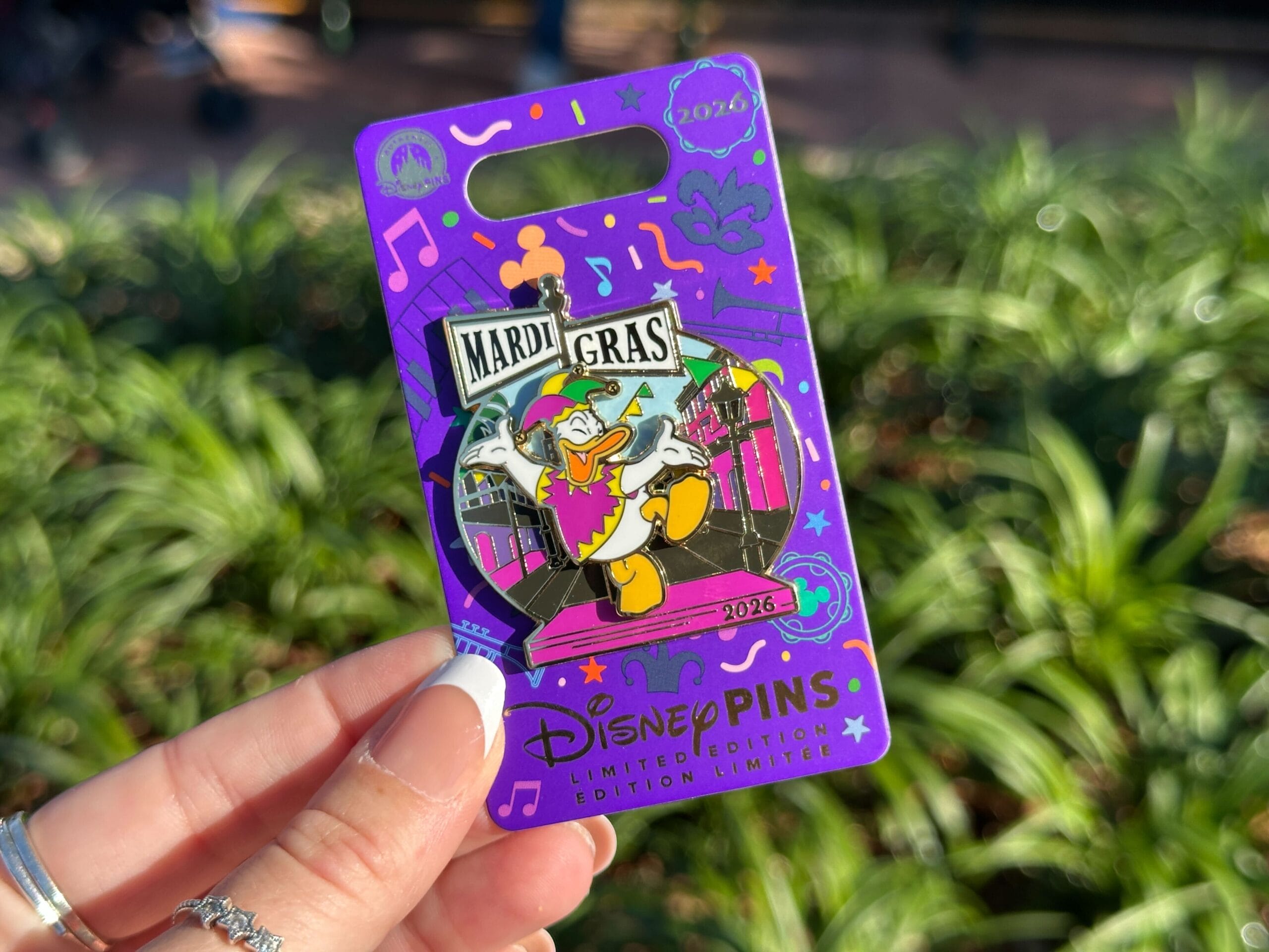 This year’s Mardi Gras pin depicts Donald Duck on a New Orleans street — or maybe at Disney’s Port Orleans Resort – French Quarter. He’s wearing a jester’s outfit and colorful bunting hangs around him. “2026” is in the lower corner and “Mardi Gras” is on a street sign. This is limited edition 4500.