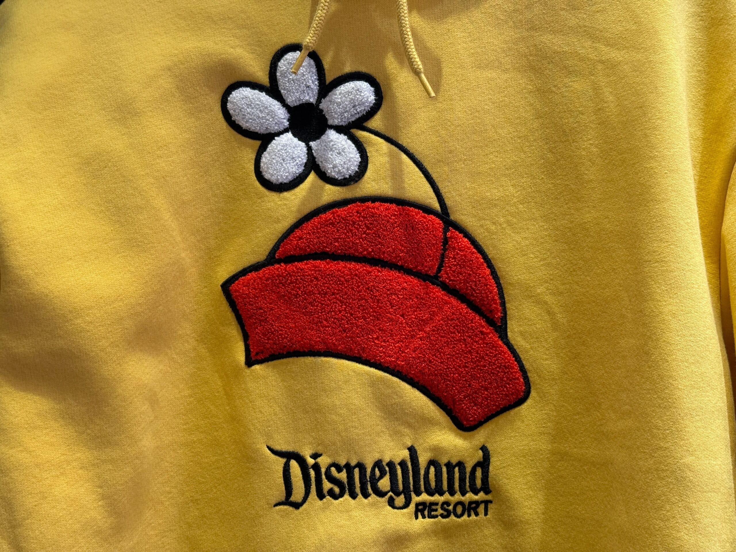 This yellow pullover hoodie features Minnie Mouse’s vintage red pillbox hat that she wears with her blue polka dot skirt. There is a white and black flower coming up from the hat’s brim. Disneyland Resort is embroidered under the hat.