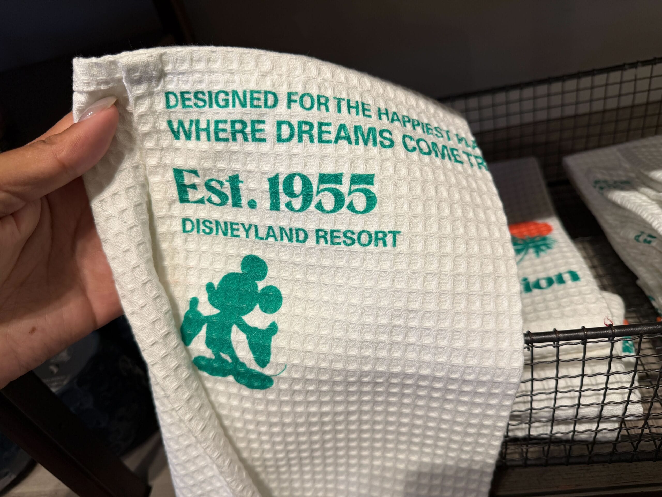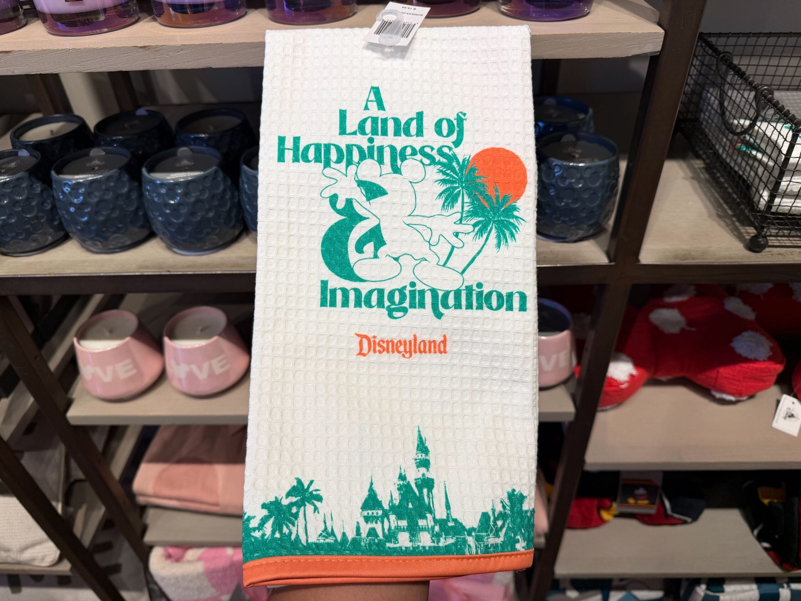 ![Elsewhere on the towel in teal are the words "Designed for the Happiest Place [on Earth] Where dreams come true." Below that are "est. 1955," "Disneyland Resort," and a solid teal image of Mickey. There is also a bright orange Disneyland wordmark beside a tiny Sleeping Beauty Castle icon.](https://r2-media.wdwnt.com/2026/02/disney-home-kitchen-towel-detail.jpg)
