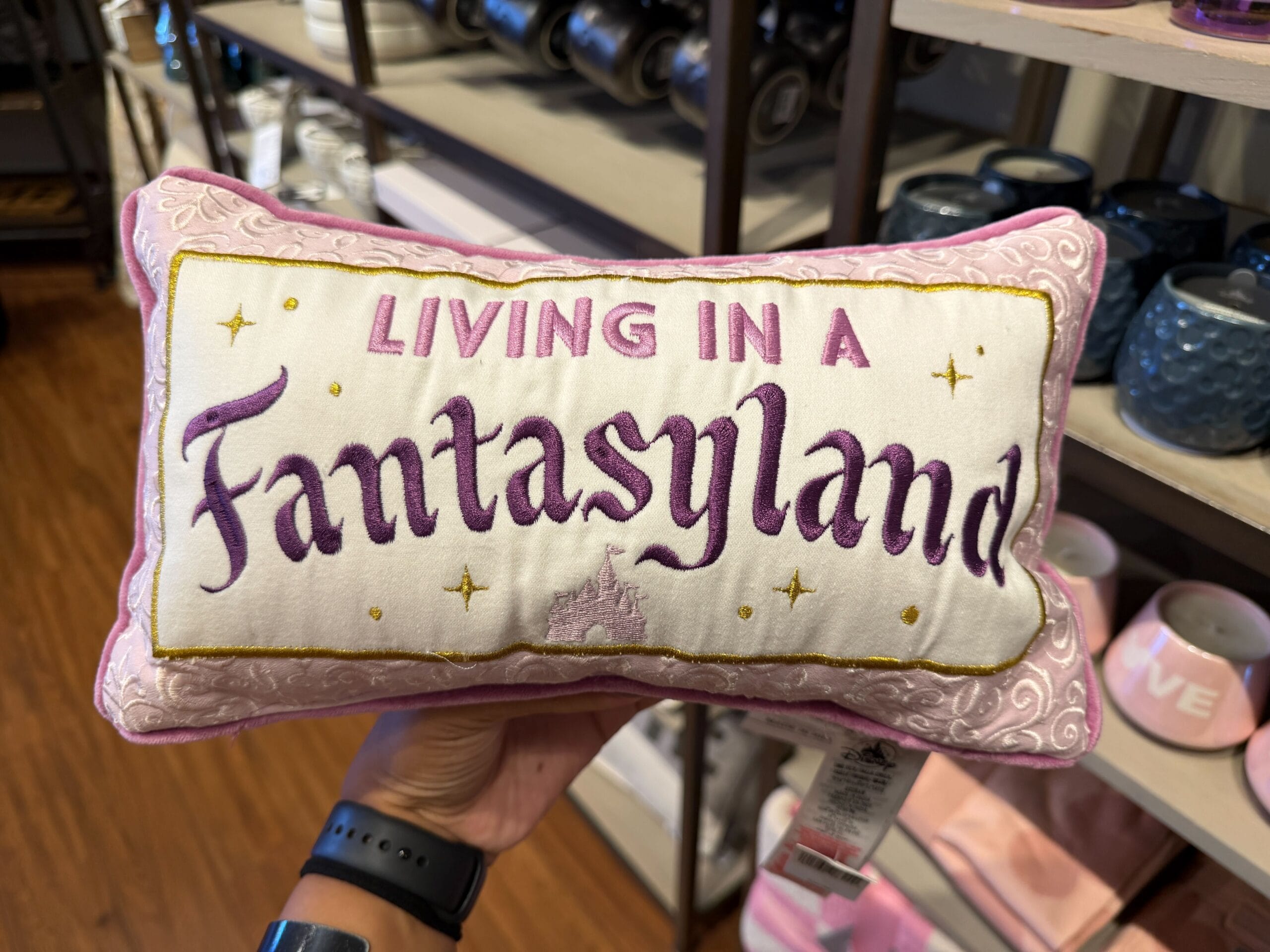 This rectangular throw pillow is themed after Fantasyland. The outer border is lavender with white scrollwork. The interior is white with a gold border. The words “Living in a Fantasyland” are embroidered in pink and purple in the center. They are surrounded by gold embroidered stars, and a pink Fantasyland castle sits at the bottom of the design.