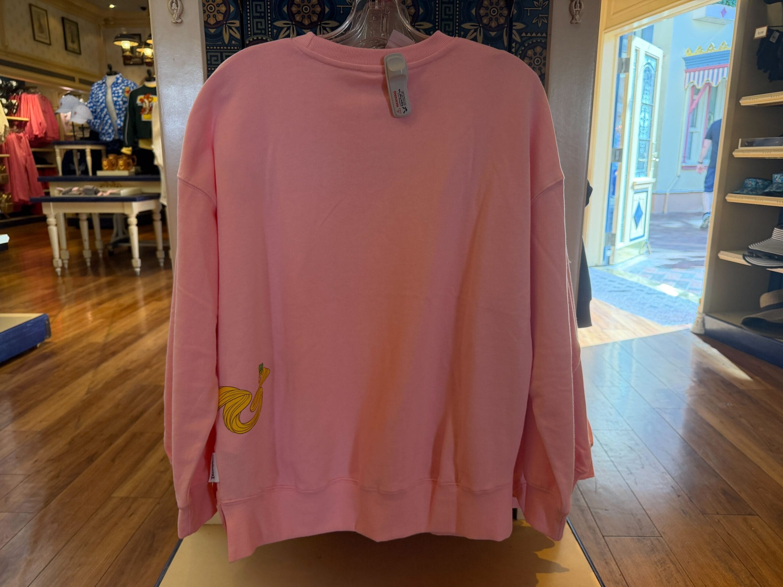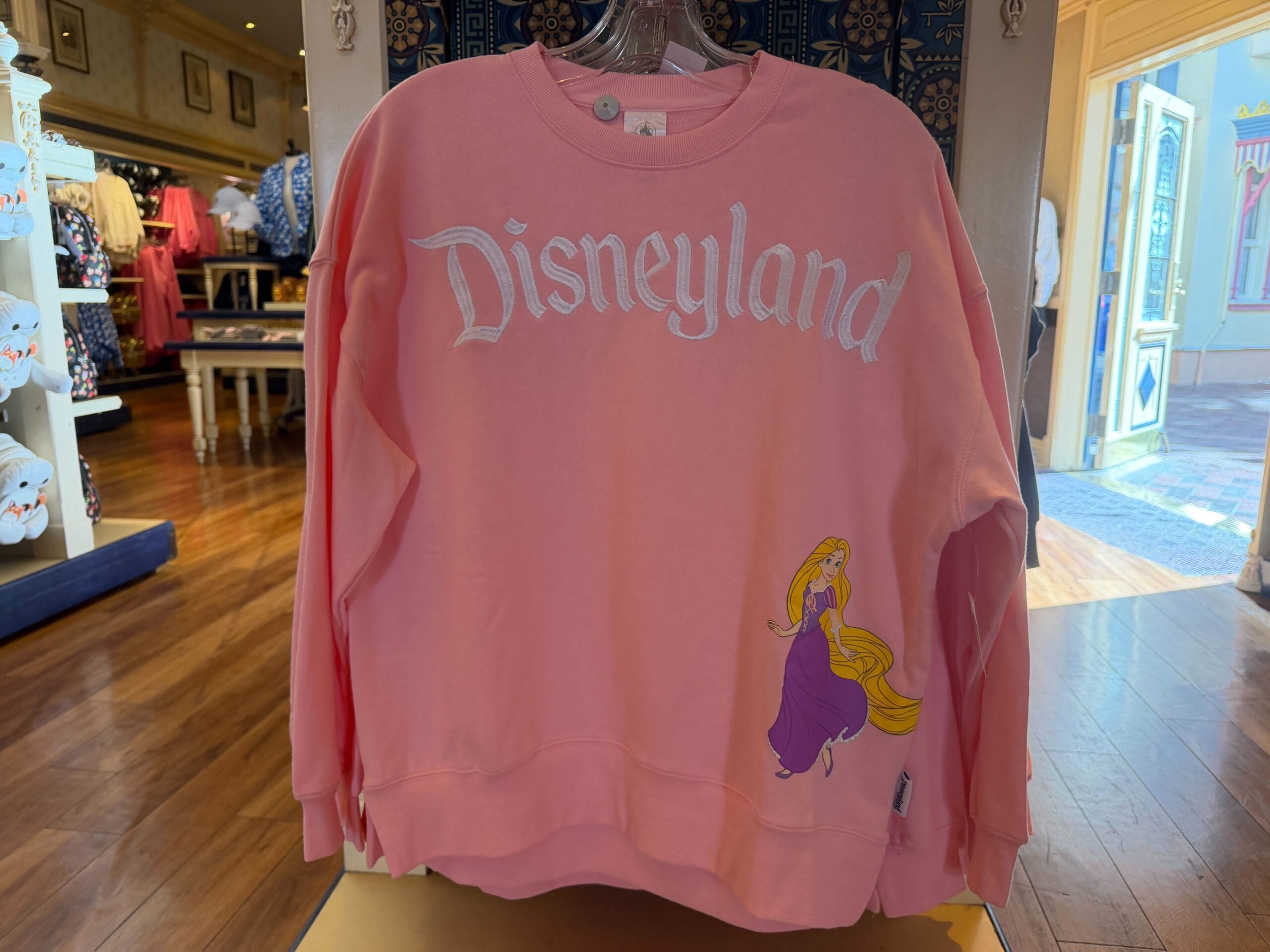 This pastel pink sweatshirt has a prominent white “Disneyland” appliqué across the chest. On the left-hand bottom side of the sweatshirt is a full-color image of Rapunzel with her hair extending off around the side of the shirt.