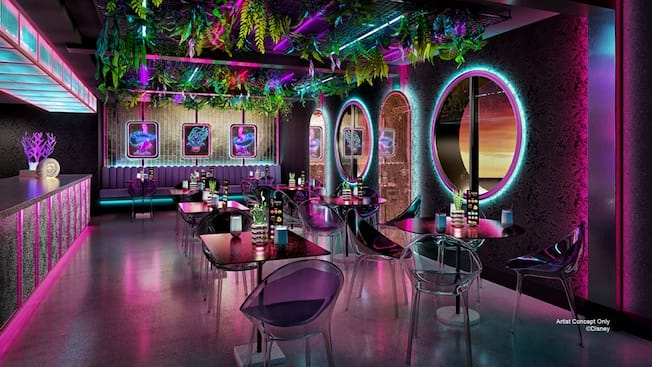 Go underwater at Discovery Reef with The Little Mermaid, Finding Nemo, Lilo & Stitch, and Luca. It’s an open-air retreat at the back of the ship with themed shopping and dining. Coral reef structures and glass canopies give the feeling that you’re under the sea. At night, it becomes an underwater bioluminescent paradise.
