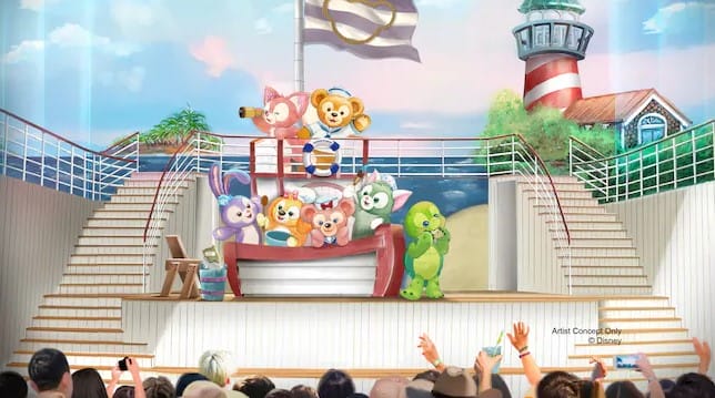 The storybook castle artwork behind the stage is inspired by castles from Disney stories and theme parks. It features nods to the Walt Disney Pictures castle, Le Château de la Belle au Bois Dormant at Disneyland Paris, and Rapunzel’s castle. Sketches by Disney artists Herbert Ryman, Frank Armitage, and Eyvind Earle also influenced the artwork, which sits above a decorative waterfall surrounded by a wave motif.