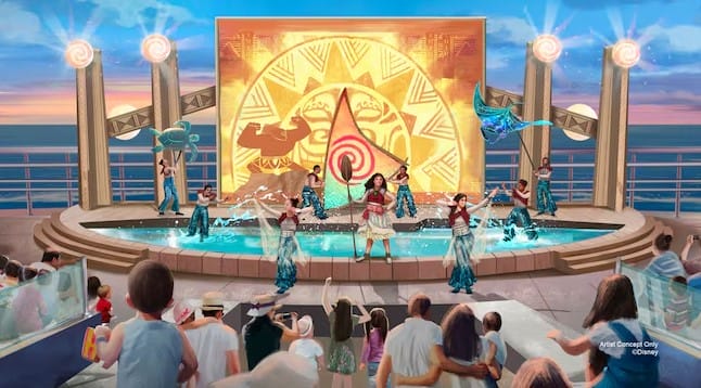 Wayfinder Bay is a spot to unwind and enjoy entertainment inspired by Moana. There is tiered deck seating with a combination of chairs, couches, and loungers. Guests can also enjoy a drink from the shaded Wayfinder Bar in front of the wading pool.