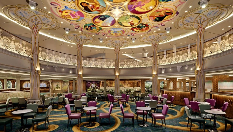 There are several themed dining locations, cafes, and shops. It’s also where the Walt Disney Theatre is located, which hosts the Broadway-style shows Disney Cruise Line is known for.