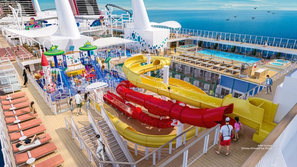 The Toy Story films spring to life in the pool area, which spans the center of the upper decks. Guests will enjoy the Sunnyside Family Pool, Woody and Jessie’s Wild Slides, the Flying Saucer Splash Zone, the Toy Story Splash Pad, and several whirlpool spas.
