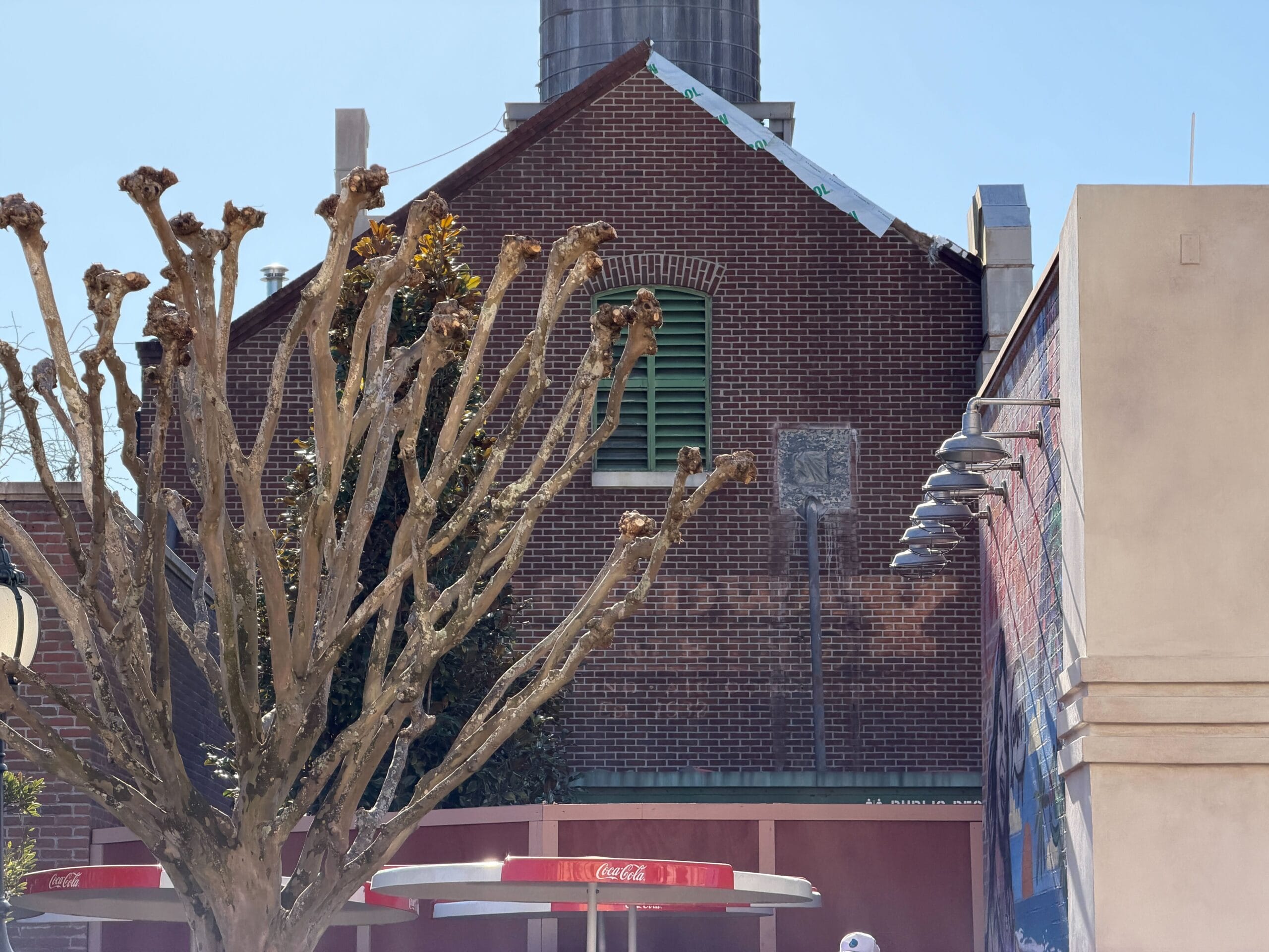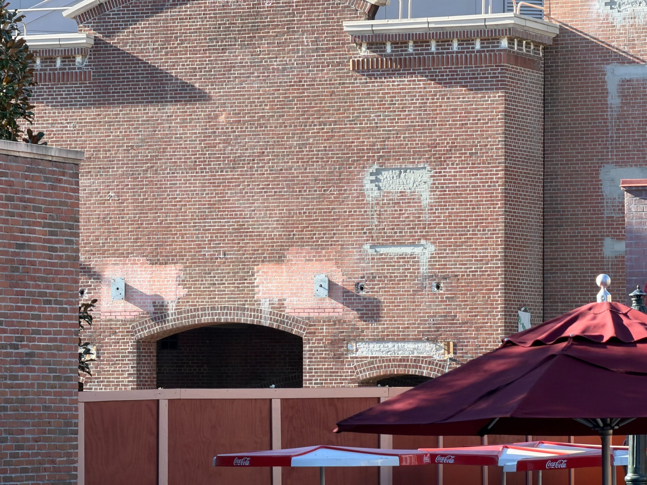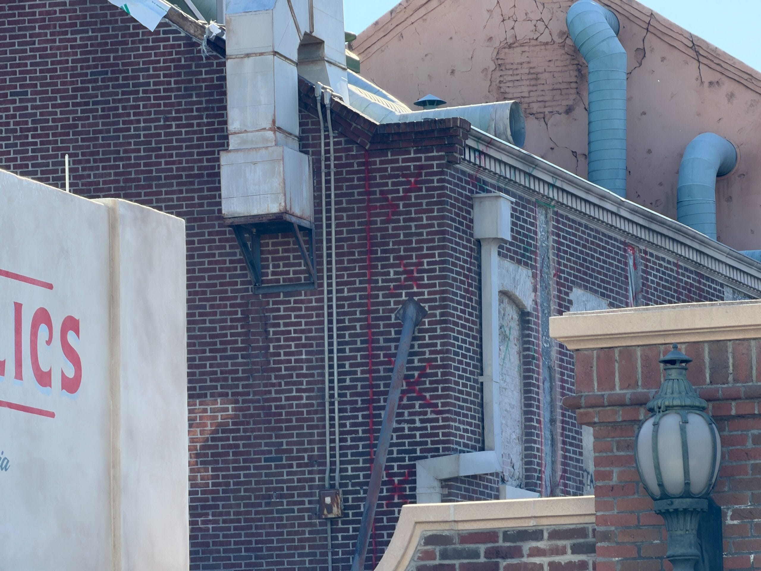 Some of the markings left on the front of the MuppetVision 3D building when bricks and windowsills were removed have been cleaned off. The theater’s marquee and awnings were also removed earlier during the construction process. It’s expected to get a brand-new marquee.