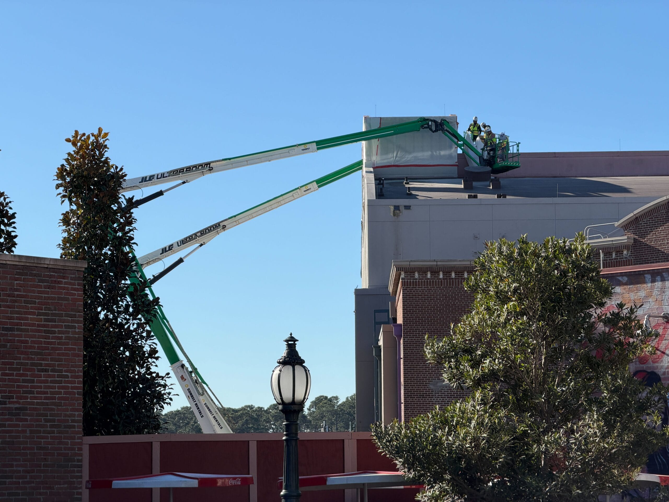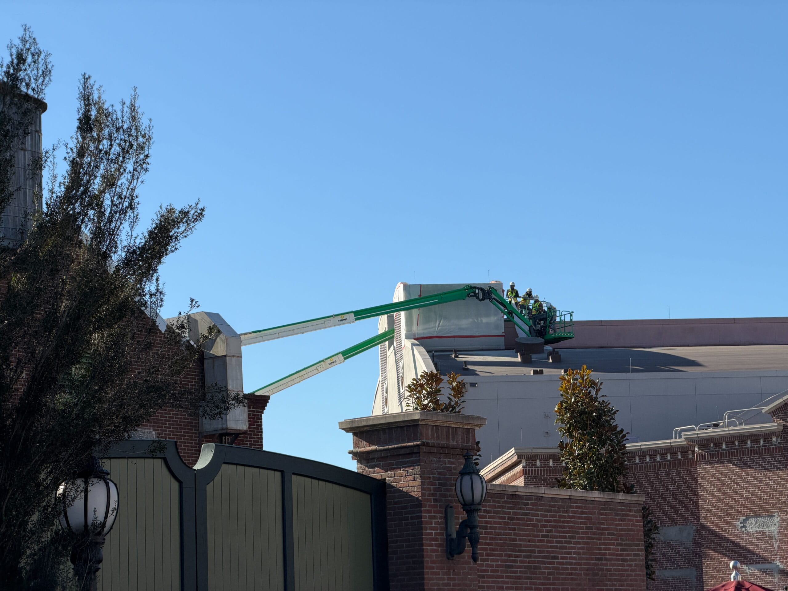 On Wednesday morning, February 4, we saw crew members working on one of the towers of the larger section of the building. This is the area that holds the actual theater, while the brick facade is the entrance and queue.