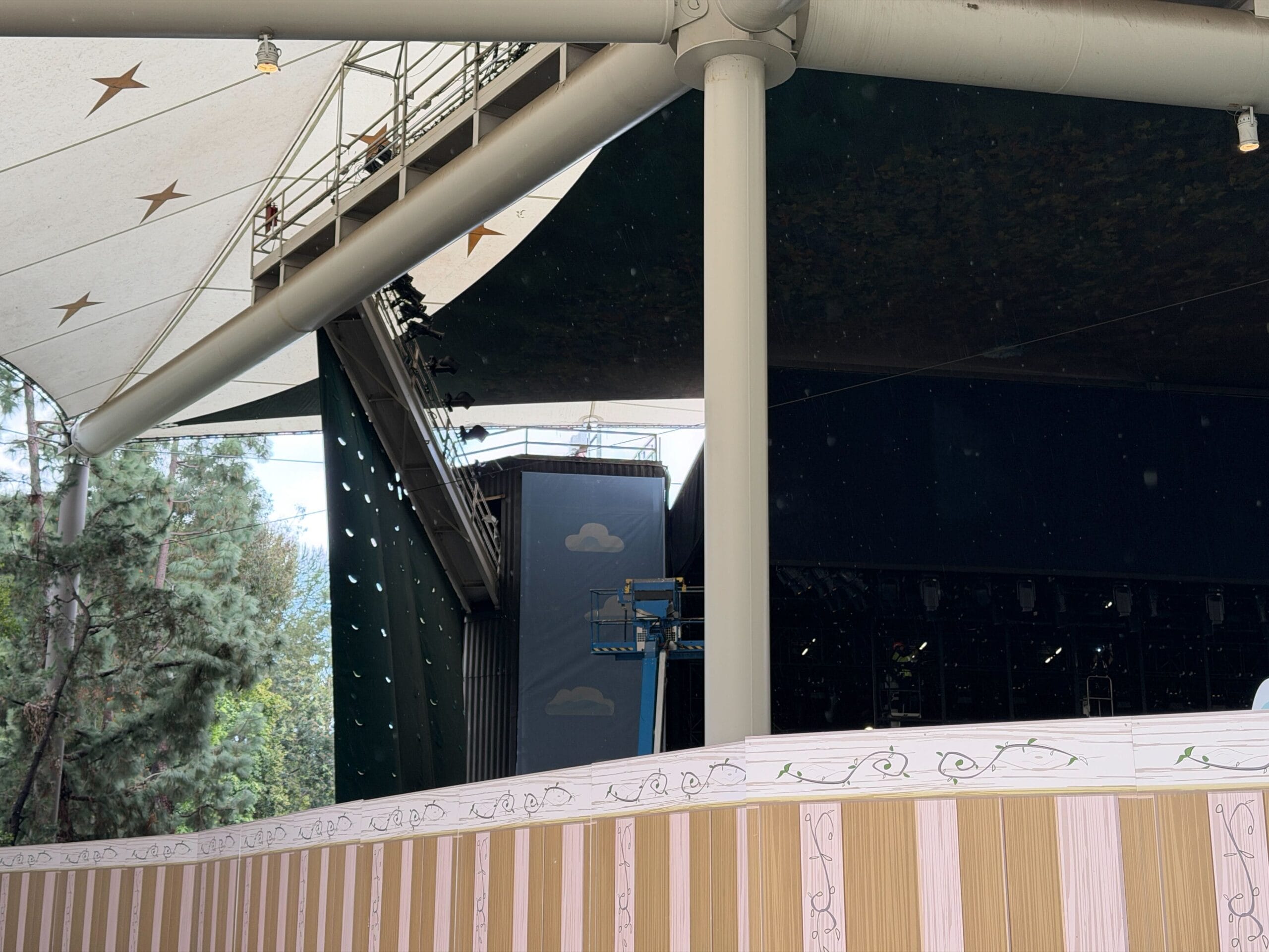 In our last update, we noted themed blue walls had been installed around the theater. There is now a pair of cartoon-ish fake trees, mostly covered by green scrim.