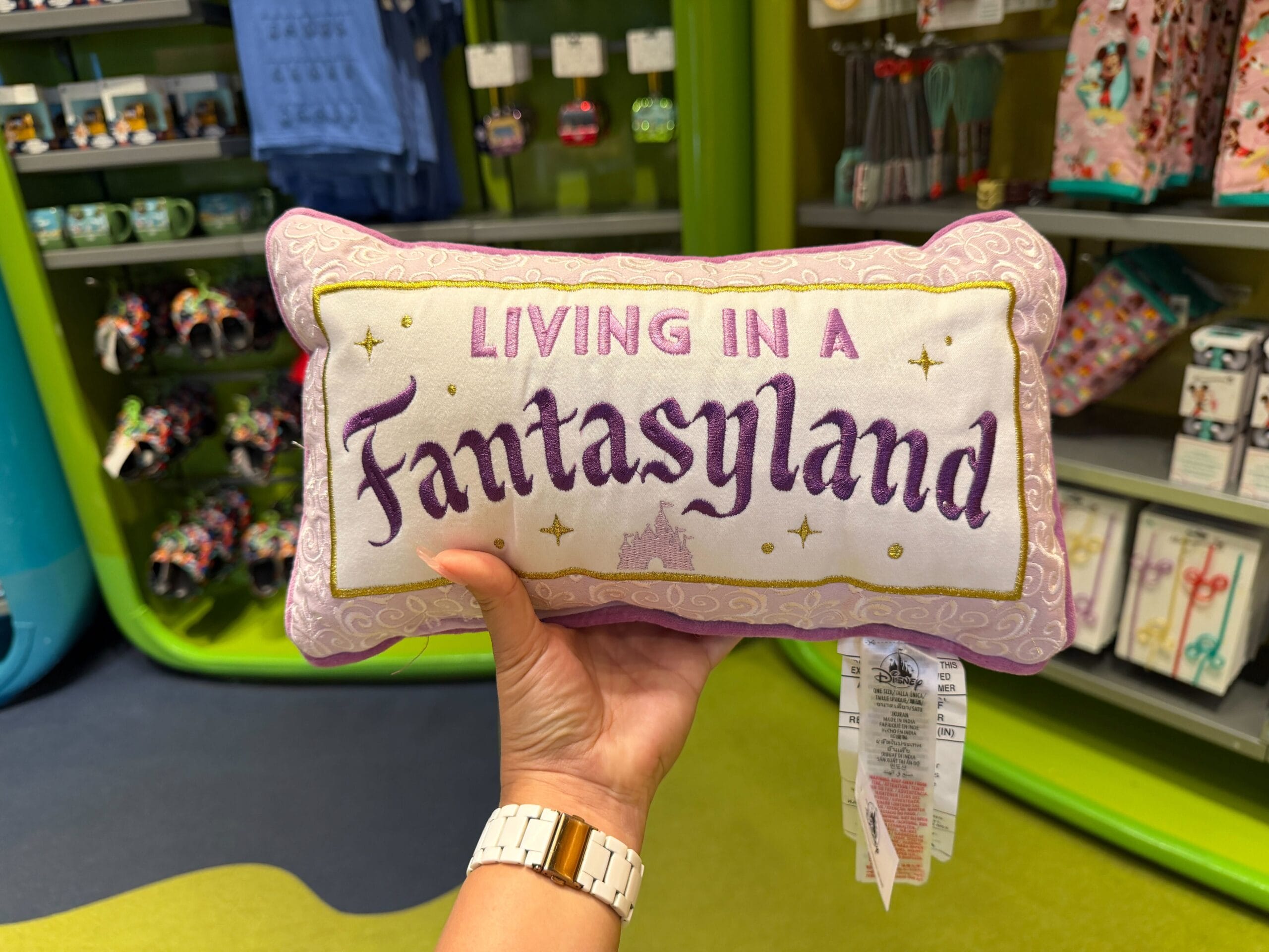 The Fantasyland pillow is rectangular with pink-purple piping around the edge. “Living in a Fantasyland” is embroidered on the front in purple and pink lettering. It’s surrounded by gold pixie dust embroidery and a castle silhouette near the bottom. A border is lilac with white filigree.