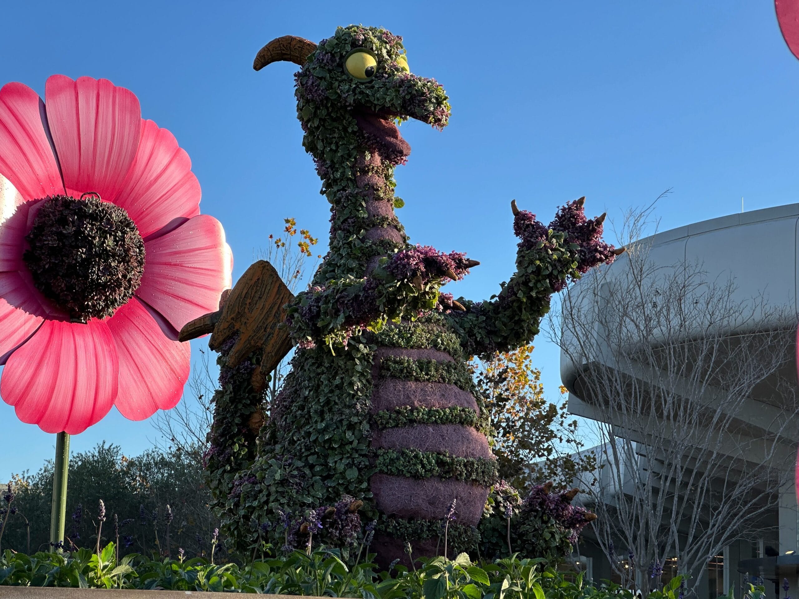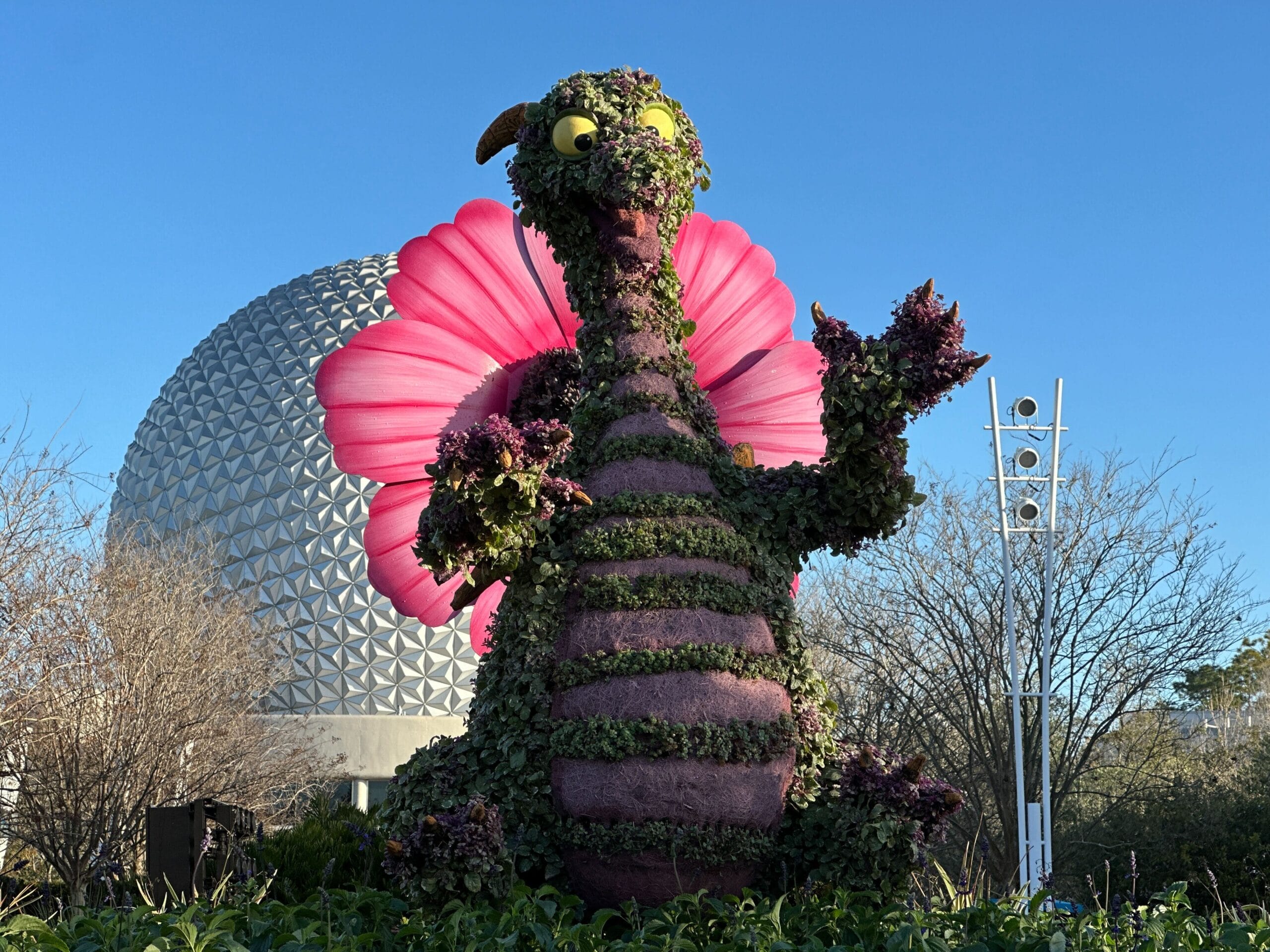 Disney used to position the Figment topiary outside Journey Into Imagination. Beginning with the 2024 Flower & Garden Festival, Figment was added to the center of the park. He sits in the long planter at the end of World Celebration Gardens on the bridge to World Showcase, with three pink topiary flowers around him.